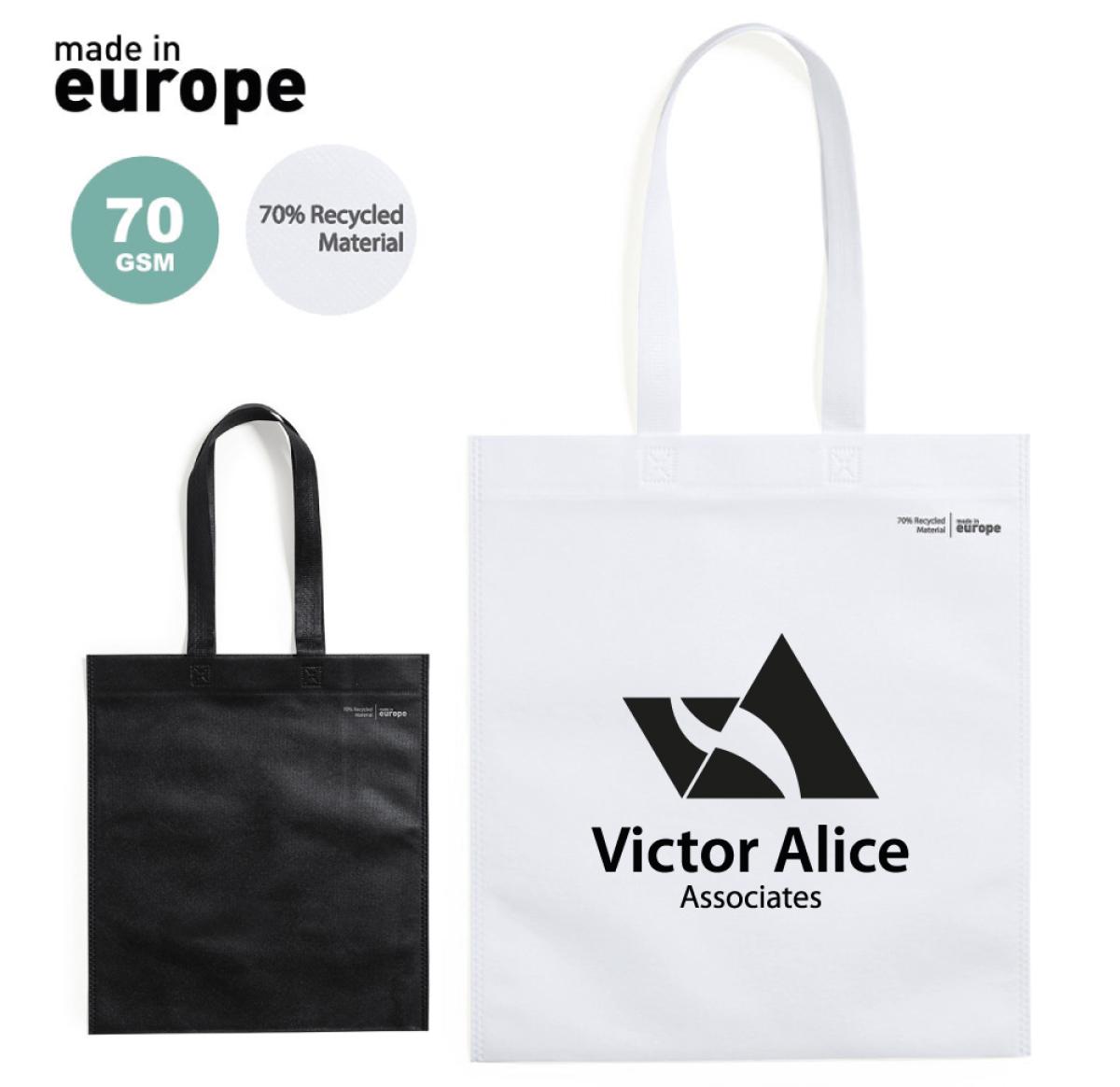 Nature line bag, made of 70g/m2 recycled non-woven. Made in Europe, with heat-sealed finish, long handles and eco/made in emblem on the bag.