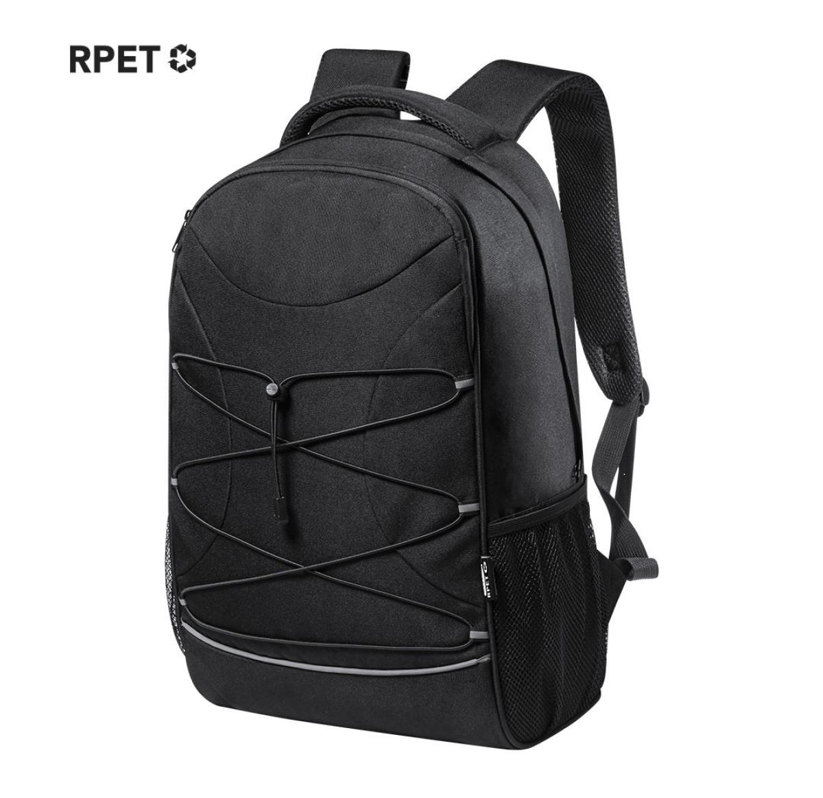 Nature line, padded urban backpack in durable 600D RPET, made from recycled plastic, to promote the reuse of plastic waste and contribute to the sustainability of the planet. Zippered main pocket with reflective strip and outside compartment with elastic straps and adjuster. Mesh side pockets and inside padded pocket for laptops up to 15 inches and tablets up to 12". Adjustable padded shoulder straps with reinforced, padded carry handle. RPET emblem on outer label.