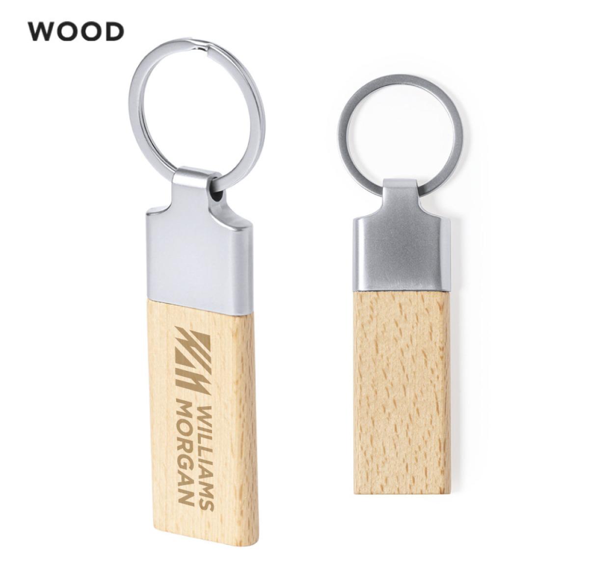 Key ring in a combination of glossy metal and varnished beech wood. With a wide surface for branding and presented in an individual bag with kraft card.