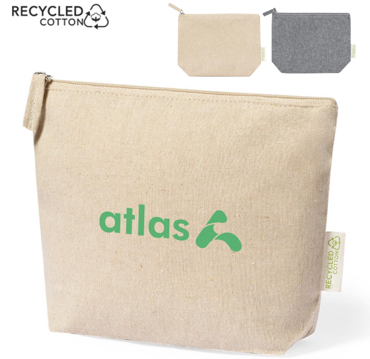 Beauty bag made of resistant, 100% recycled cotton material in 180g/m2. With GRS (Global Recycled Standard) certification, which guarantees the recycled origin of the material used to manufacture the product. Zip closure with matching puller and eco emblem on the outside label.