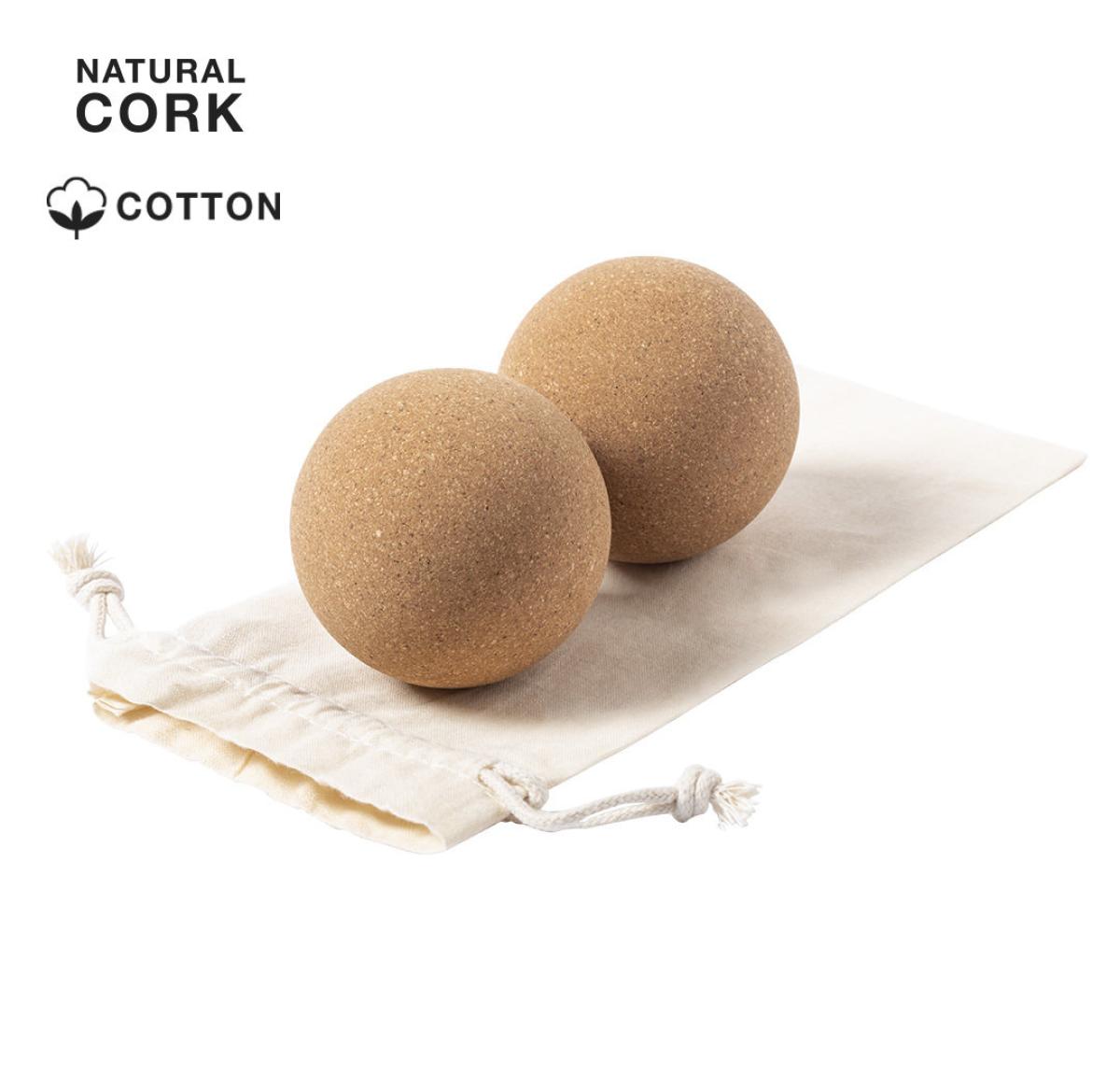 Nature line set of 2 balls for yoga and other activities. Made of resistant, natural cork and presented in a cotton bag with drawstring closure. With exercises illustrations.