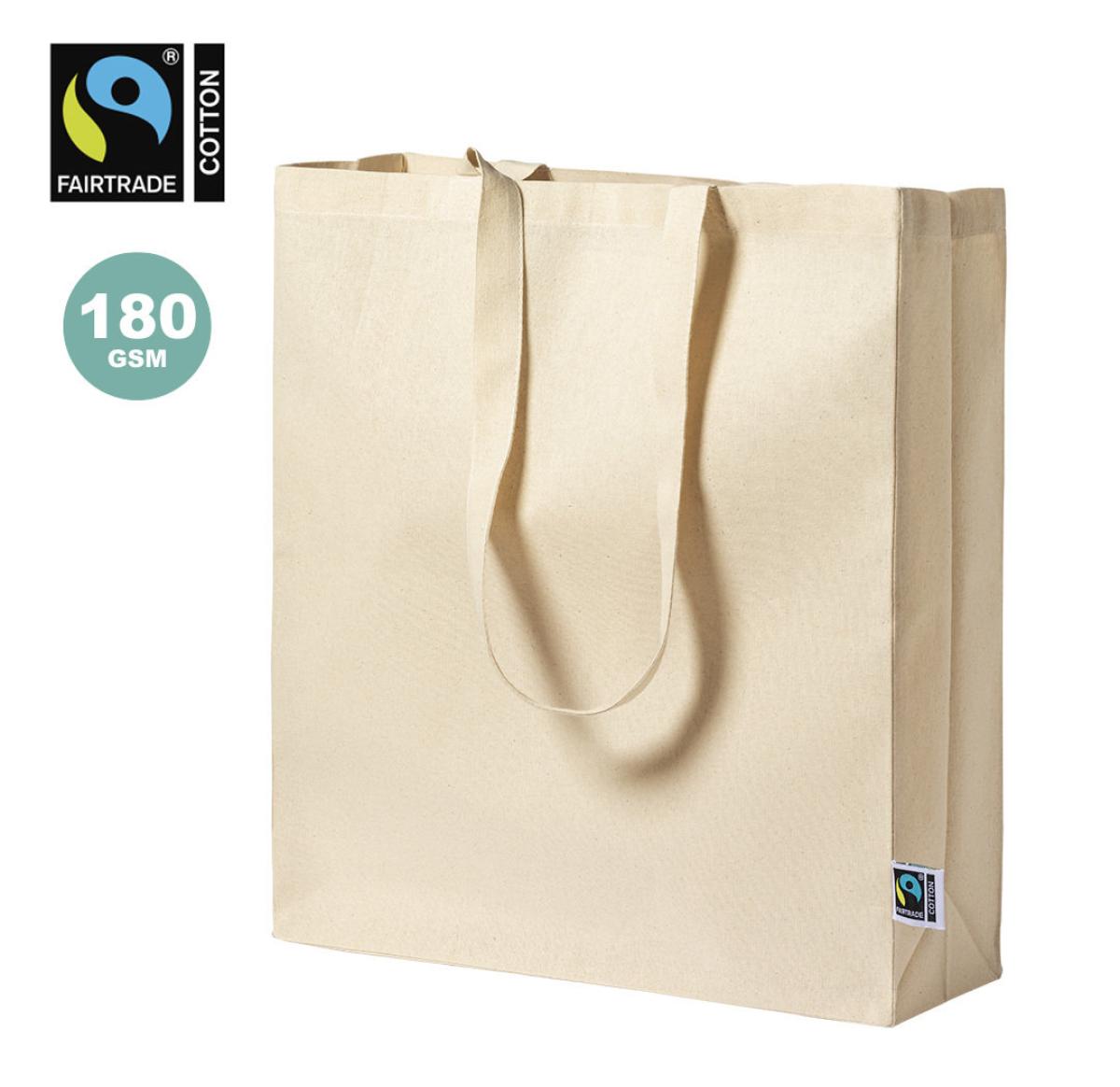 Nature line bag, made of 100% cotton 180g/m2 in a natural tone. With Fairtrade certification, an alternative to the conventional trade system that pursues the development of peoples and the fight against poverty. Stitched finish, with gusset and 70cm in length handles, with resistance up to 7kg weight. Including Fairtrade label and hangtag in recycled cardboard.