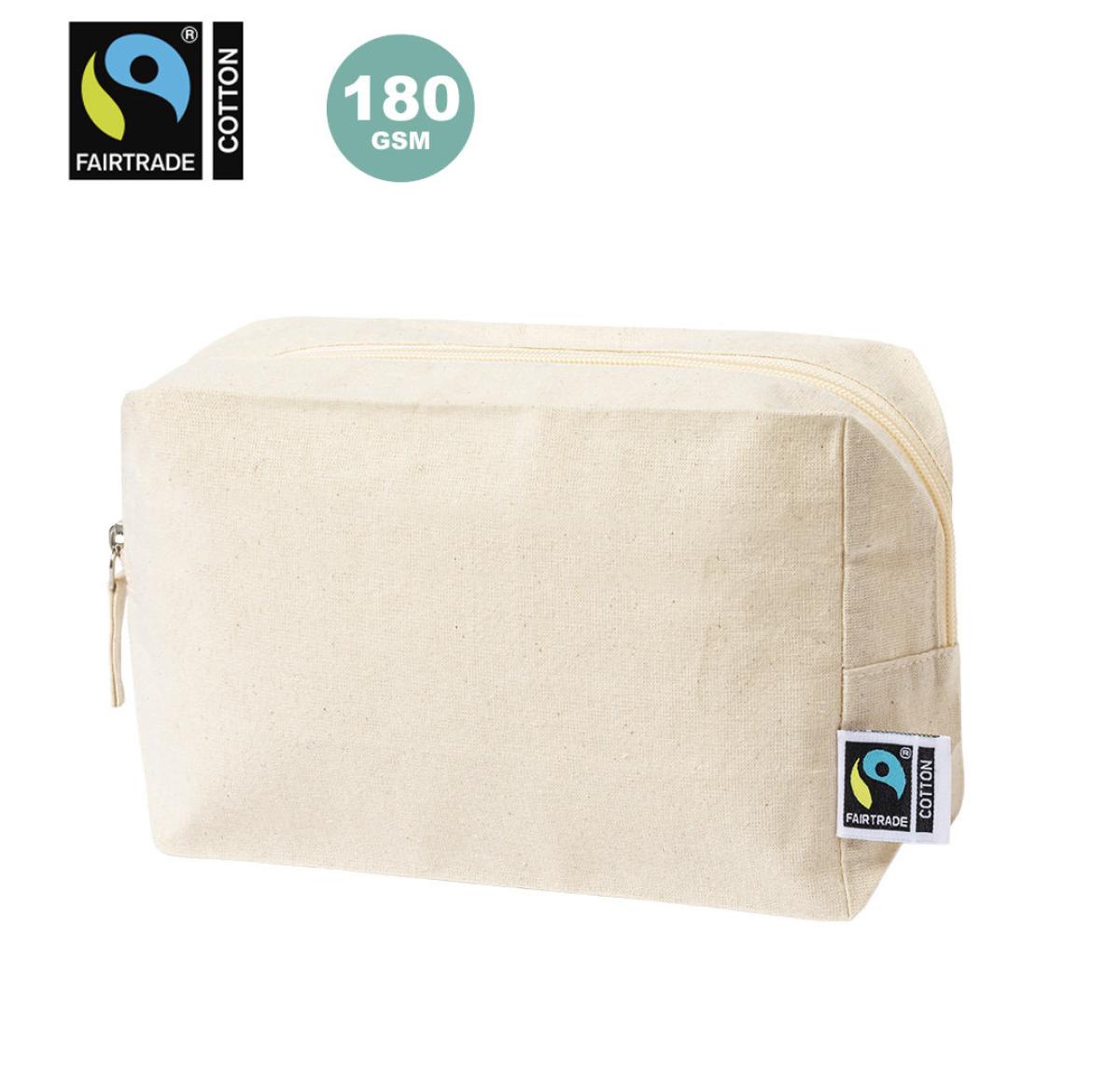 Nature line beauty bag, made of 100% cotton 180g/m2 in a natural tone. With Fairtrade certification, an alternative to the conventional trade system that pursues the development of peoples and the fight against poverty. Main compartment with zip closure and matching puller, including Fairtrade label and hangtag in recycled cardboard.