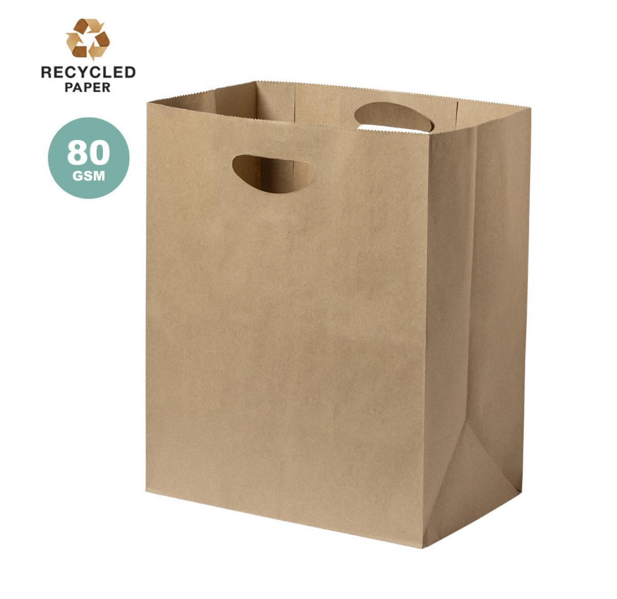 Nature line, lightweight bag made of 80g/m2 recycled paper. With original die-cut handle and gusset.