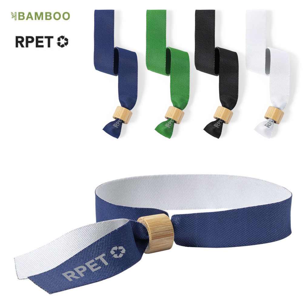 Nature line, event wristband. In RPET polyester 160g/m2, made from recycled plastic to promote the reuse of plastic waste and contribute to the sustainability of the planet. With bamboo fastener and available in a wide range of colours, white colour specially designed for sublimation printing. RPET emblem printed on the wristband.