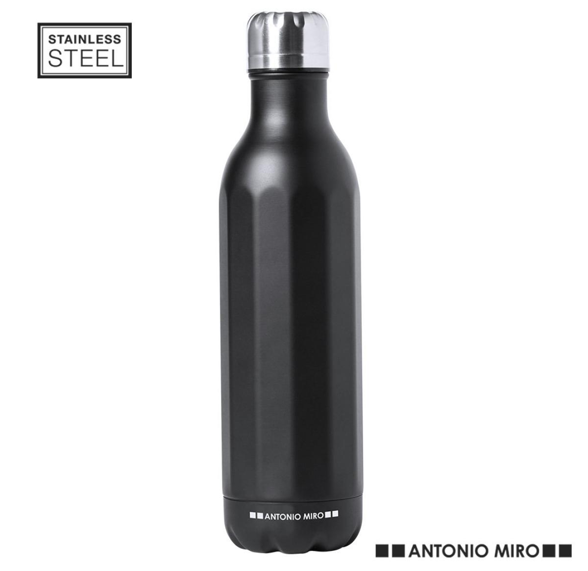 Stainless steel bottle by Antonio Miró. 750ml capacity and sober satin black finish, with prism body and brand logo at the base. Chromed screw-on lid and presented in an attractive design box with brand logo.