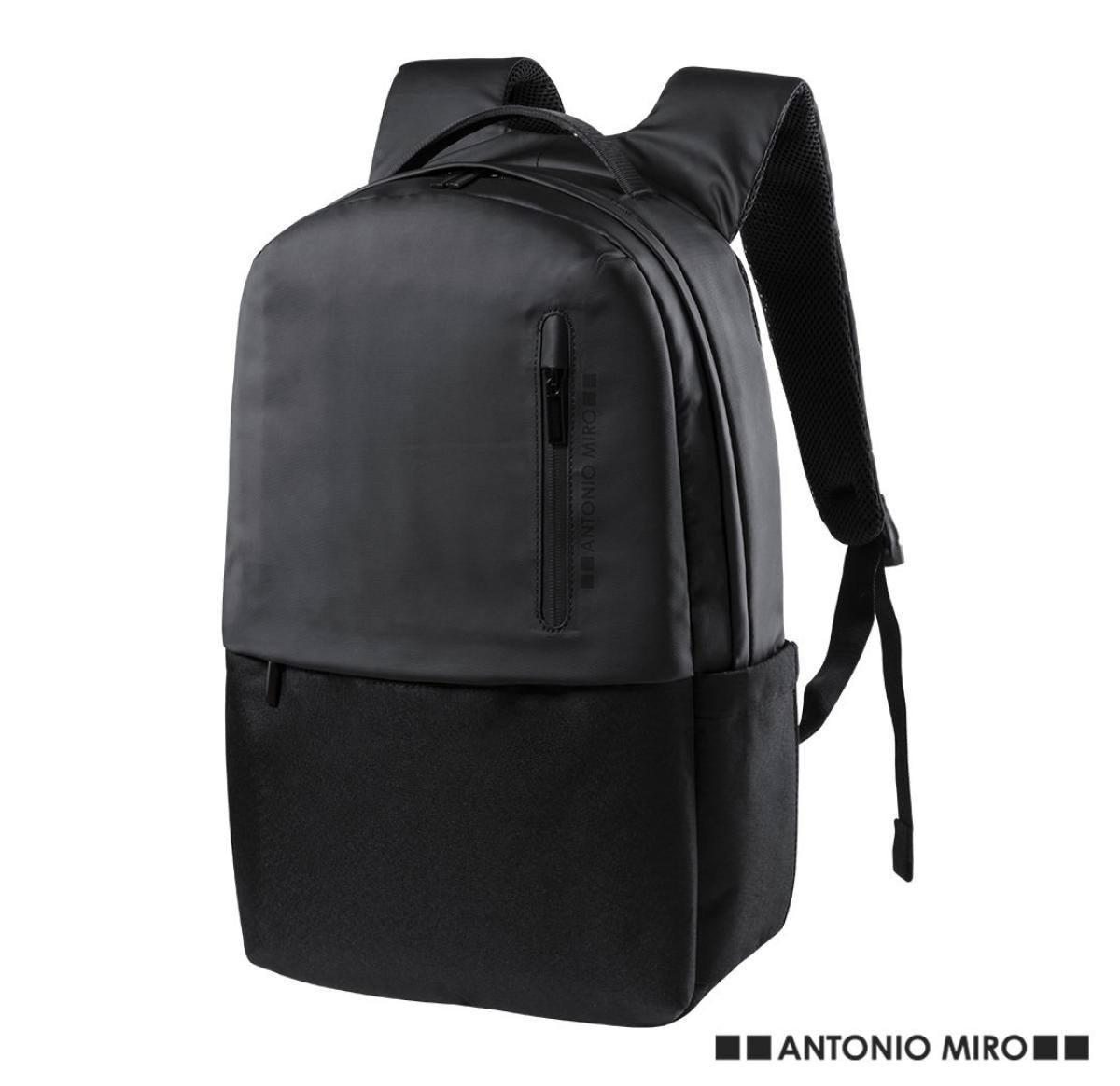 Premium quality Antonio Miro backpack in durable 600D polyester, with a sober design in black. With zip closure, front pocket and reinforced metal handle. Ergonomically padded back and shoulder straps, with padded inside compartment for laptops up to 15 inches and tablets up to 10 inches. Inner sleeves for pens and smartphone. With brand logo at front.