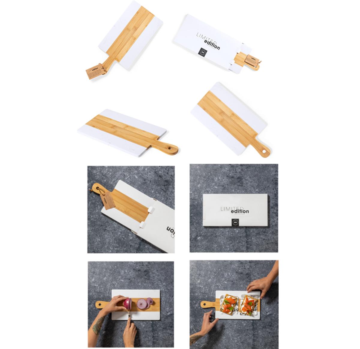 Cutting board and presentation Limited Edition. A new style that combines modern and traditional. Made from natural materials such as bamboo and marble extract. Smooth and durable polished finish and handle for easy handling. From the perfect combination of exclusivity and design, come Limited Edition, a special collection of limited edition promotional ideas. A new concept, inspired by the fusion of premium products with the latest and most innovative trends and with a limited selection available, turn a gift into a unique and unforgettable experience. Exclusive Limited Edition presentation case, with a design protected by industrial property rights. Including card with description of Limited Edition in recycled cardboard.