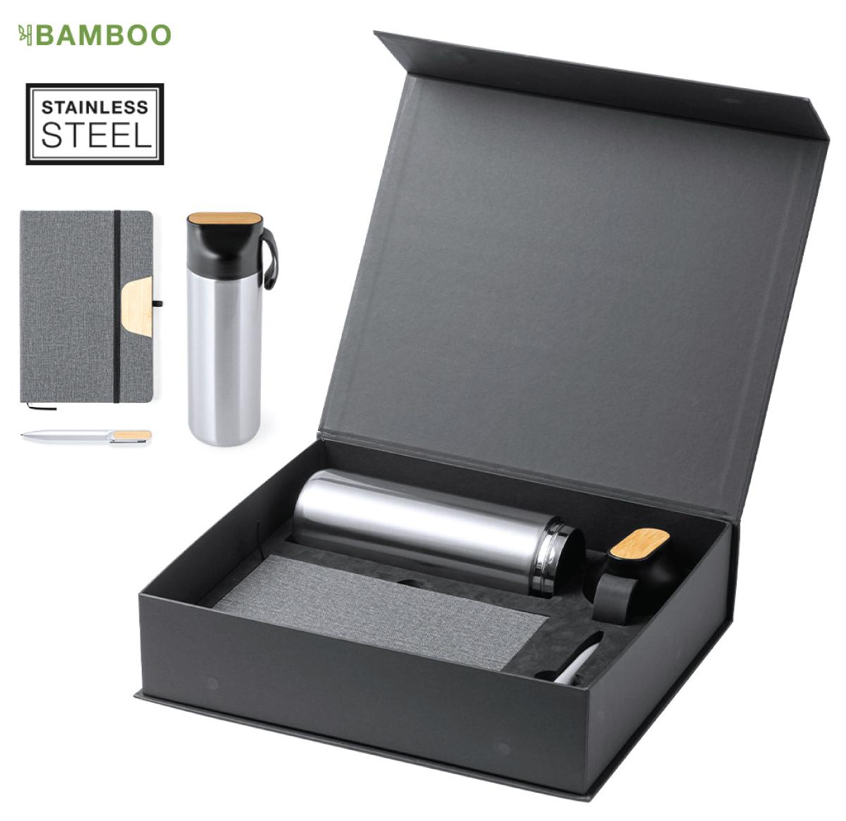 Elegant premium set, including: Double-walled thermos cup in stainless steel. 640 ml capacity, with bamboo area on the lid for branding. Soft PU notepad with integrated smartphone holder on the cover and bamboo area for branding. Including elastic closure, bookmark and matching colour pen holder. Inside with 80 single-stripe layout sheets. Matte finish aluminum ball pen with bamboo area for branding, twist mechanism and blue ink. Presented in an individual, matte-finish case with magnetic closure, including inner die-cutting for each of the set's elements.