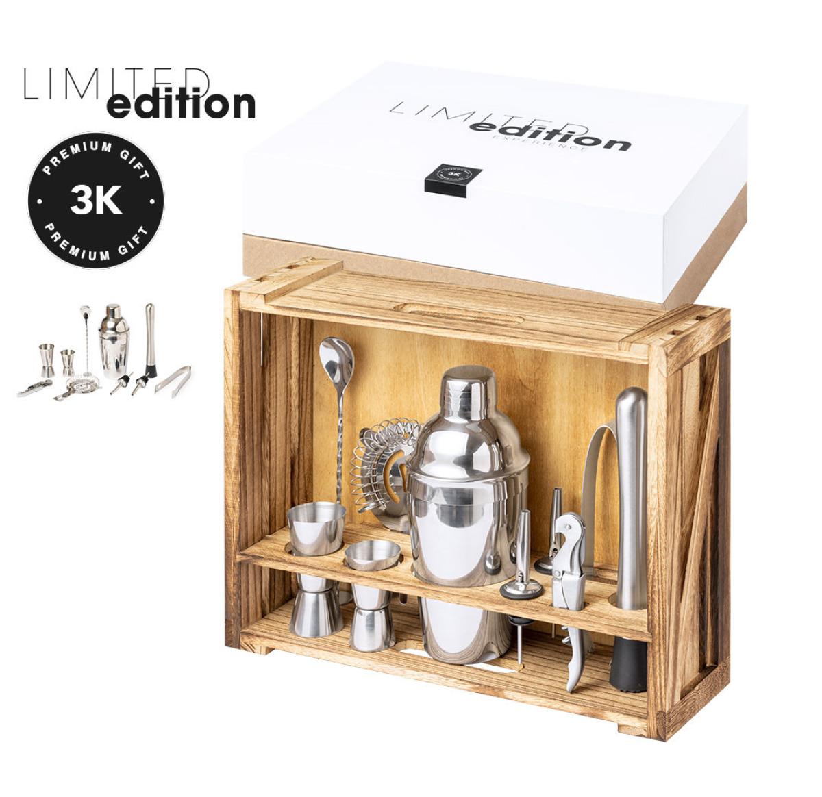 Elegant Cocktail Set Limited Edition line. A surprising set that combines modern and traditional concepts. It includes all the essential utensils to configure the best cocktails in stainless steel. Presented in a distinguished rustic-finish wooden box ideal for storing and presenting: Accessories included: - 1 shaker - 1 mortar - 1 measuring cup of 15/30ml - 1 measuring cup of 25/50ml - 1 ice tong - 1 filter - 1 opener/corkscrew - 1 mixing spoon - 2 dosing caps From the perfect combination of exclusivity and design, come Limited Edition, a special collection of limited edition promotional ideas. A new concept, inspired by the fusion of premium products with the latest and most innovative trends and with a limited selection available, turn a gift into a unique and unforgettable experience. Exclusive Limited Edition presentation case, with a design protected by industrial property rights. Including card with description of Limited Edition in recycled cardboard.