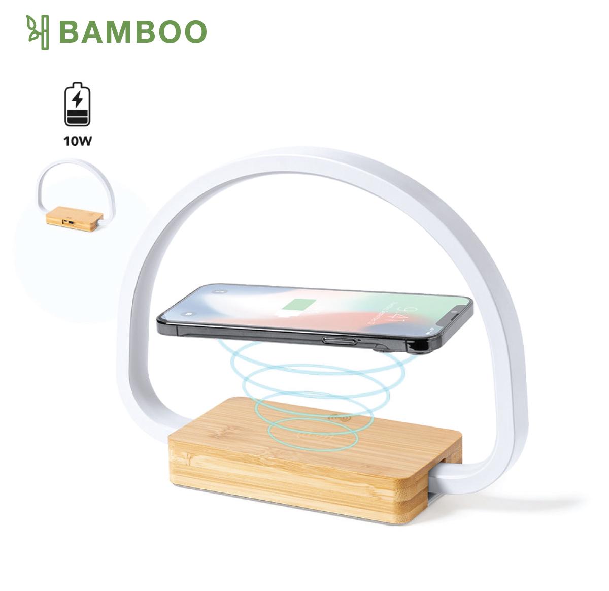 Eco design charger lamp. Made of bamboo from natural cuttings and with non-slip base. Integrated 10W wireless charger. Includes 52 LEDs and 3 lighting positions (warm, cold and medium), with adjustable light intensity. Compatible with mobile devices with wireless charging and USB connection. Includes Type C charger cable and comes in an attractive eco-design box. Available instruction manual in Spanish and English.