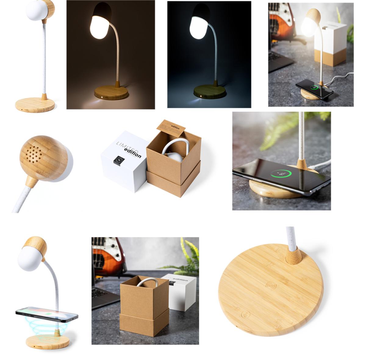 Multifunction Lamp Limited Edition with charger and speaker function. A modern and sustainable premium quality design made of bamboo. With integrated 10W wireless charger and 3W Bluetooth speaker. Lamp with 14 LEDs, 3 types of light (warm, natural and cold) and adjustable intensity. Adjustable in position and height. Compatible with wireless charging mobile devices, with 100cm micro USB charger cable. Manual instruction available in Spanish and English. From the perfect combination of exclusivity and design, come Limited Edition, a special collection of limited edition promotional ideas. A new concept, inspired by the fusion of premium products with the latest and most innovative trends and with a limited selection available, turn a gift into a unique and unforgettable experience. Exclusive Limited Edition presentation case, with a design protected by industrial property rights. Including card with description of Limited Edition in recycled cardboard.