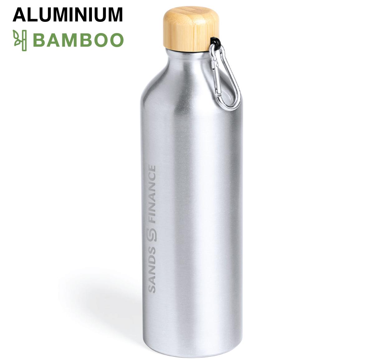 Nature line bottle with a capacity of 800 ml. Aluminum body with matte finish and bamboo lid with matching colour carabiner for portability. BPA free and presented in an attractive eco-design box.