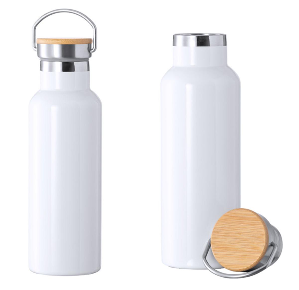500 ml capacity thermal bottle, made in stainless steel with double wall and specially designed for sublimation printing. Gloss white finish with matching screw cap in stainless steel, with bamboo detail and integrated handle. BPA free and presented in an individual box with kraft design.