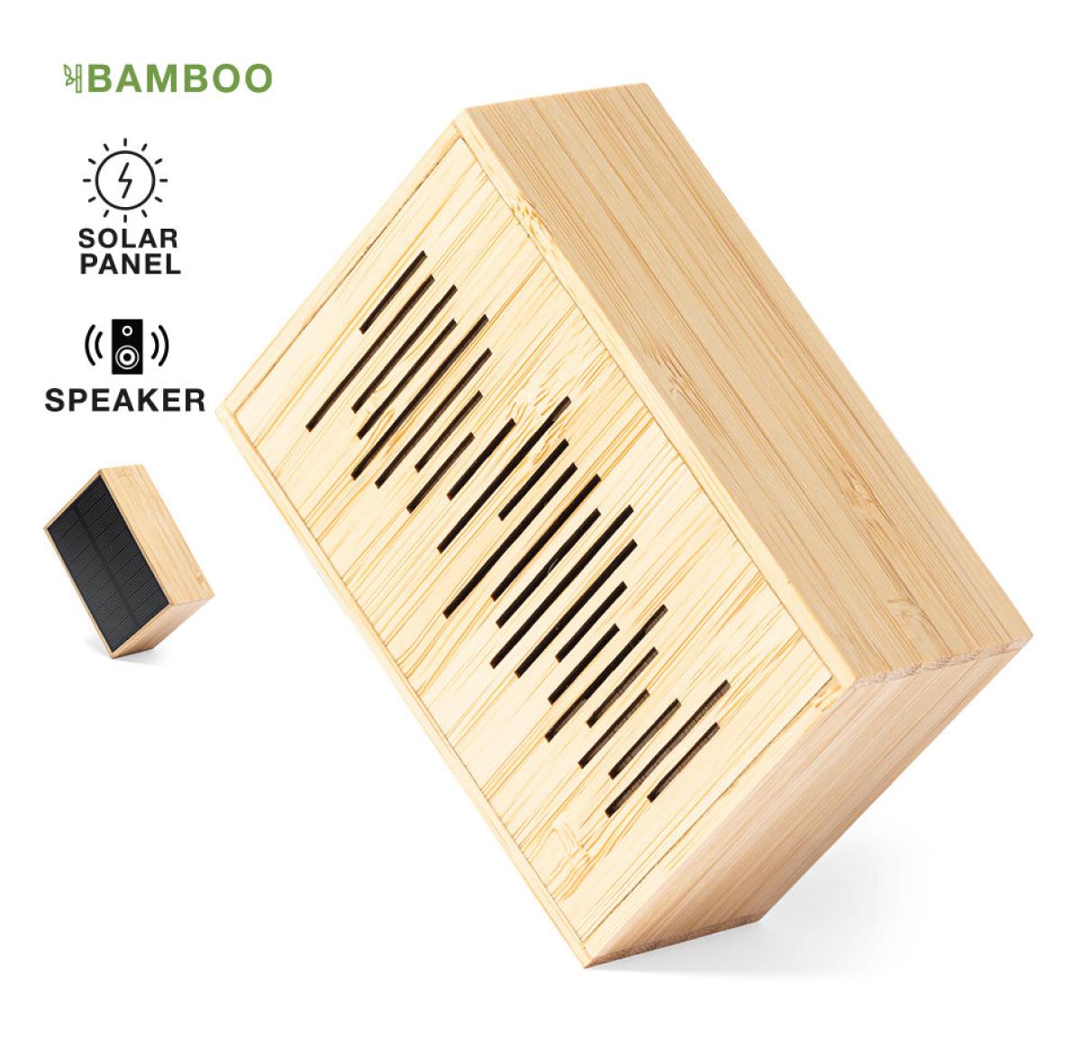 Solar speaker in nature line, made of bamboo from sustainable forests with FSC certification. Rechargeable by integrated solar panels or USB cable. Bluetooth® connection, with 3W of power. Presented in an individual eco-design box in kraft cardboard.