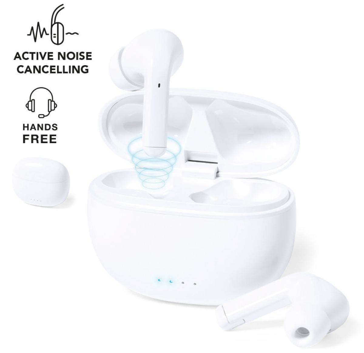 Earphones with ANC system (Active Noise Cancellation / Active Noise Cancellation), significantly reducing external noise for an optimal sound experience. Elegant white finish and Bluetooth connection. Ergonomically designed, featuring a touch control button integrated in the earphone, with matching charging base and charging status indicators. Hands-free function and USB rechargeable (cable included). Presented in an attractive design box.