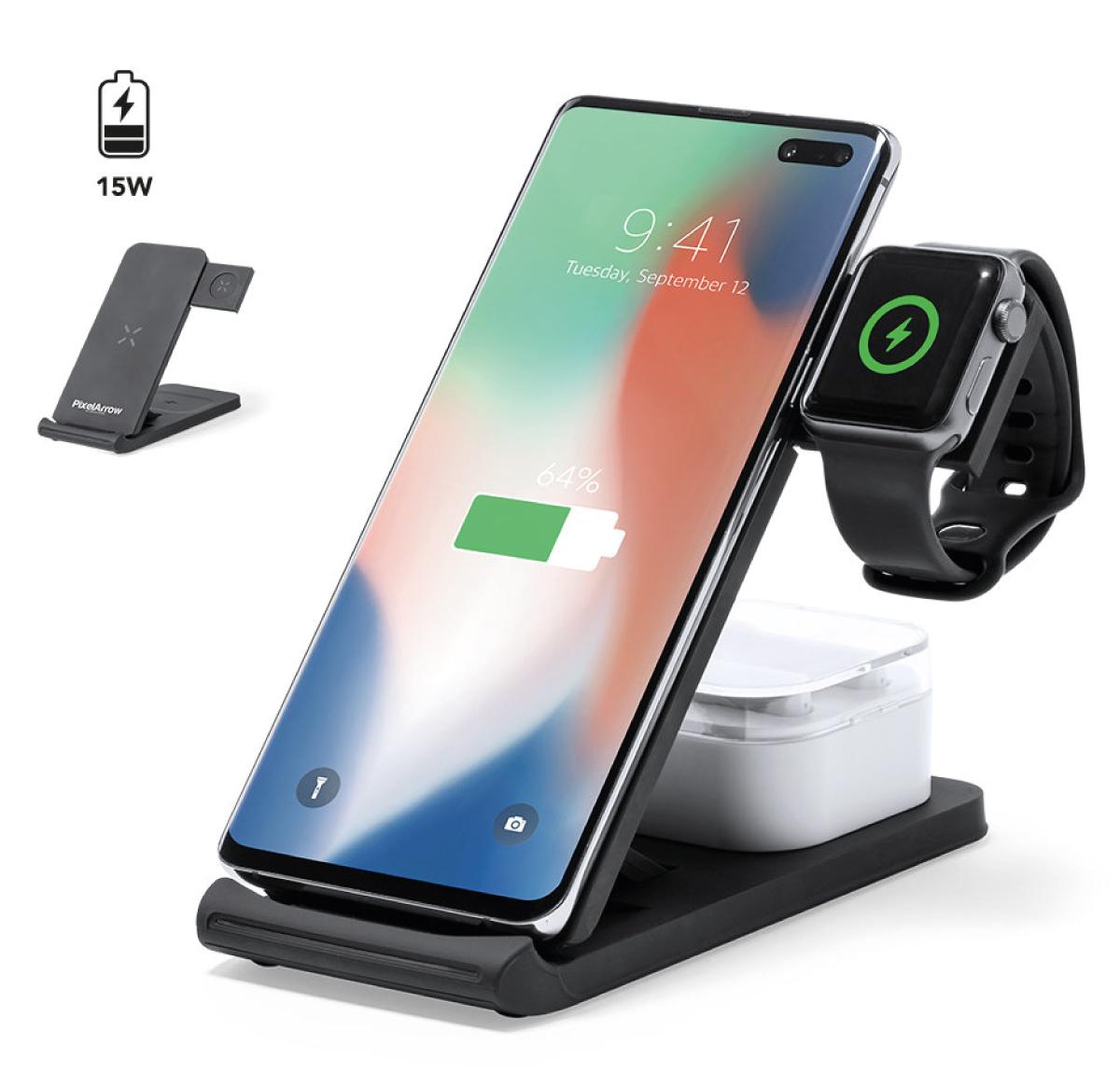 Complete 15W wireless charger with gadget holder. Designed for simultaneous charging of smartphone, headphones and smartwatch: an all-in-one, versatile, and foldable charging station. Presented in an attractive design box.