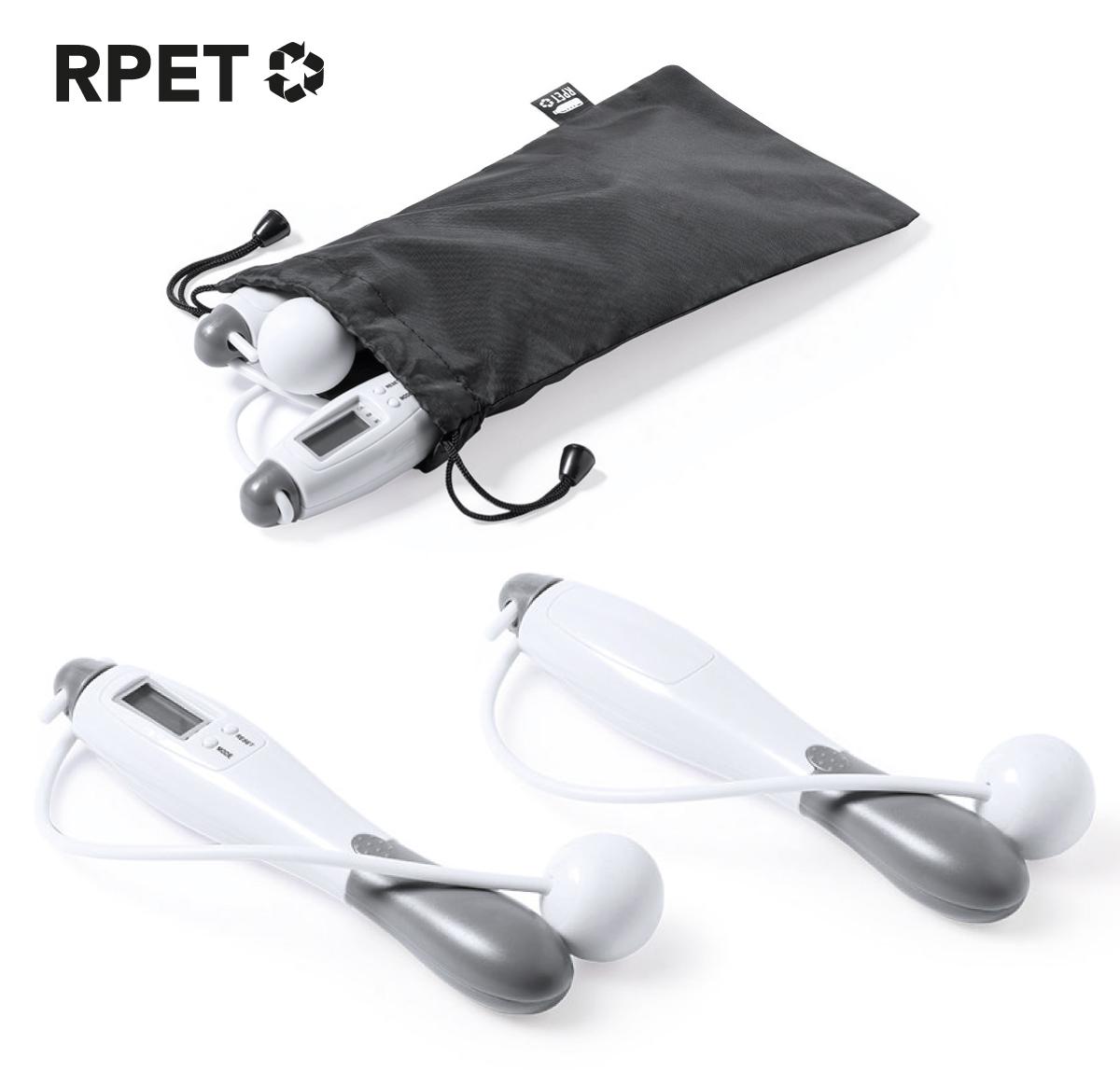 Digital jumping rope, made in resistant ABS. With ergonomic grip handles and LCD display with adjustment buttons. Presented in RPET polyester pouch with drawstring closure, made from recycled plastic to promote the reuse of plastic waste and contribute to the sustainability of the planet. Distinctive RPET label on the case. Battery powered (button cell batteries included).