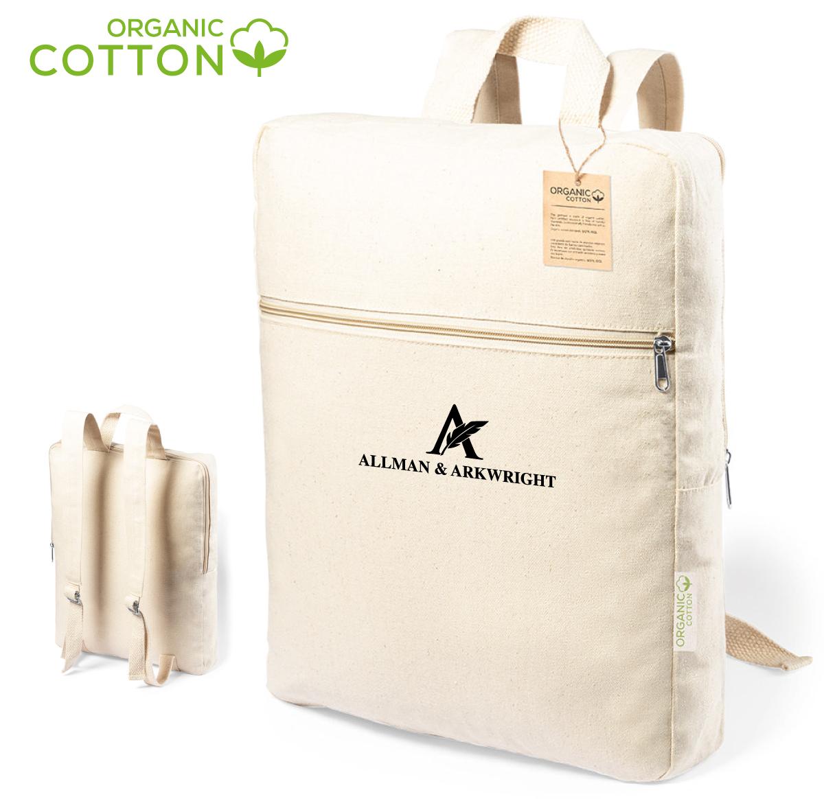 Backpack in nature line in soft 100% organic cotton material in natural colour. With front zippered pocket, carrying handle and adjustable shoulder straps. With organic logo on side label.
