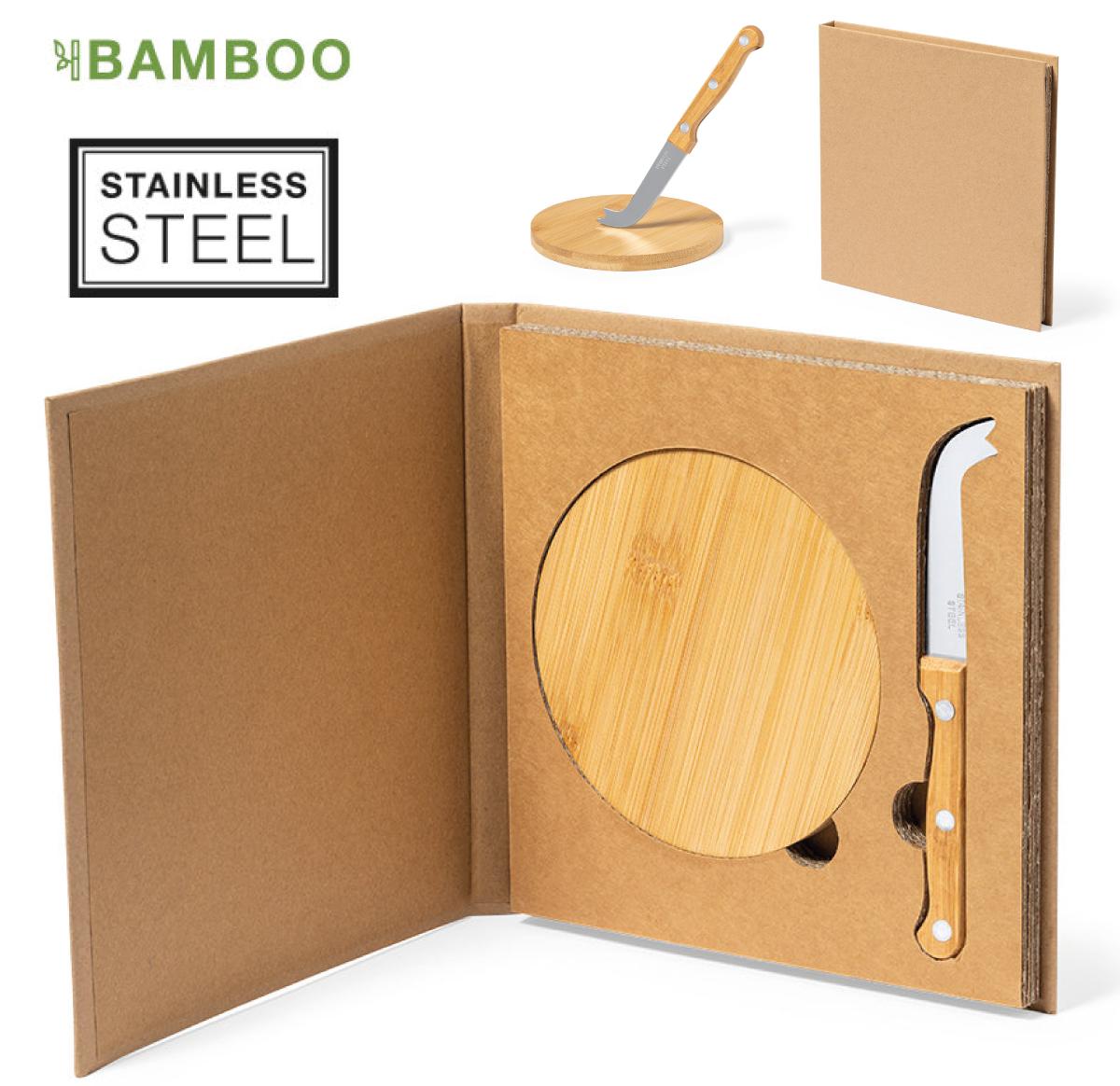 Cheese set in nature line, made of bamboo and stainless steel. Including round cutting and serving board and a special cheese knife. Presented in an individual die-cut case made of recycled cardboard with kraft finish.