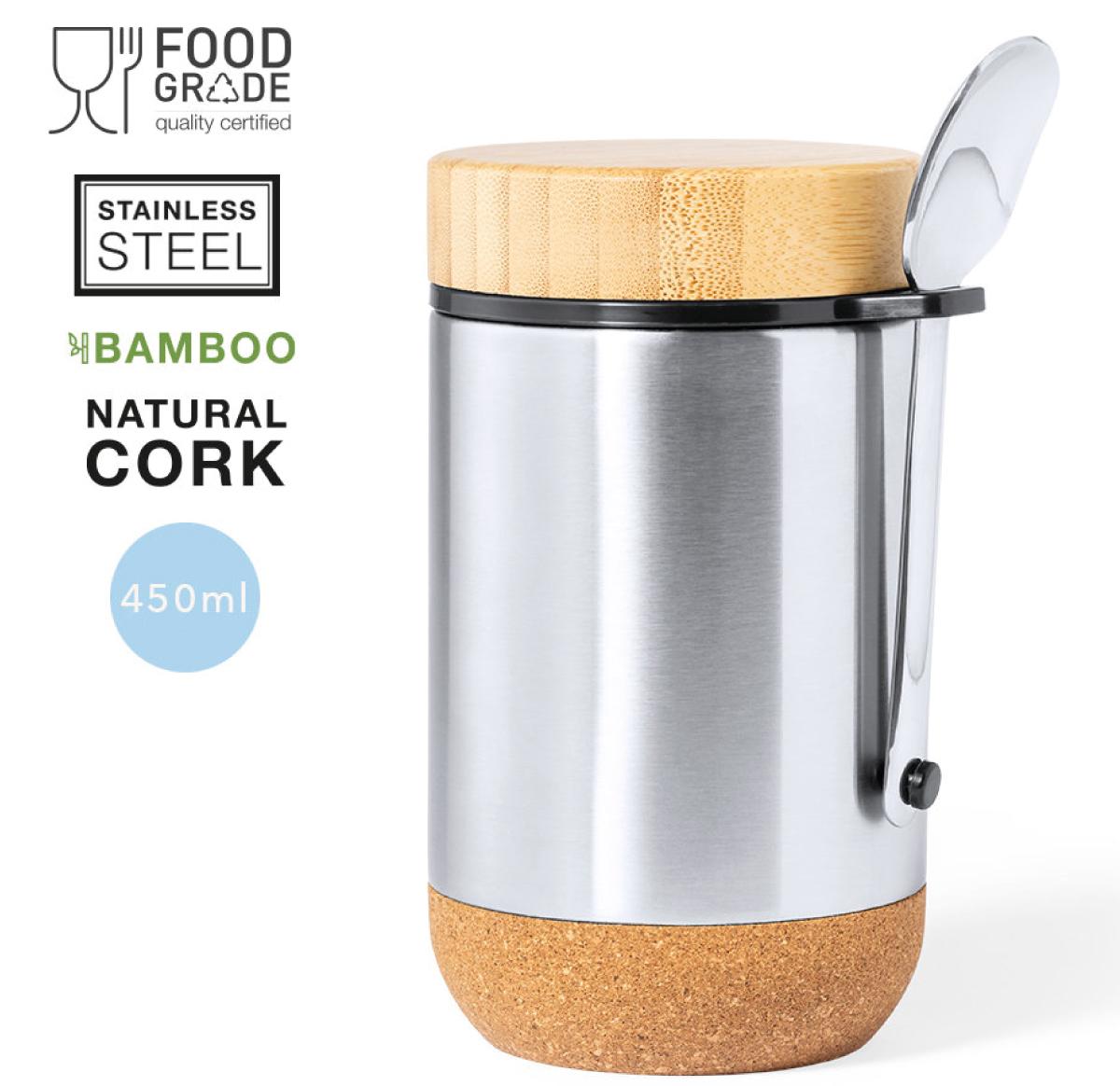 Lunch box in nature line and 450 ml capacity. Stainless steel body, with cork base to maintain the temperature and safety cap in bamboo, including attachment accessory for the stainless steel spoon (included). Presented in an individual box of eco design in kraft cardboard.