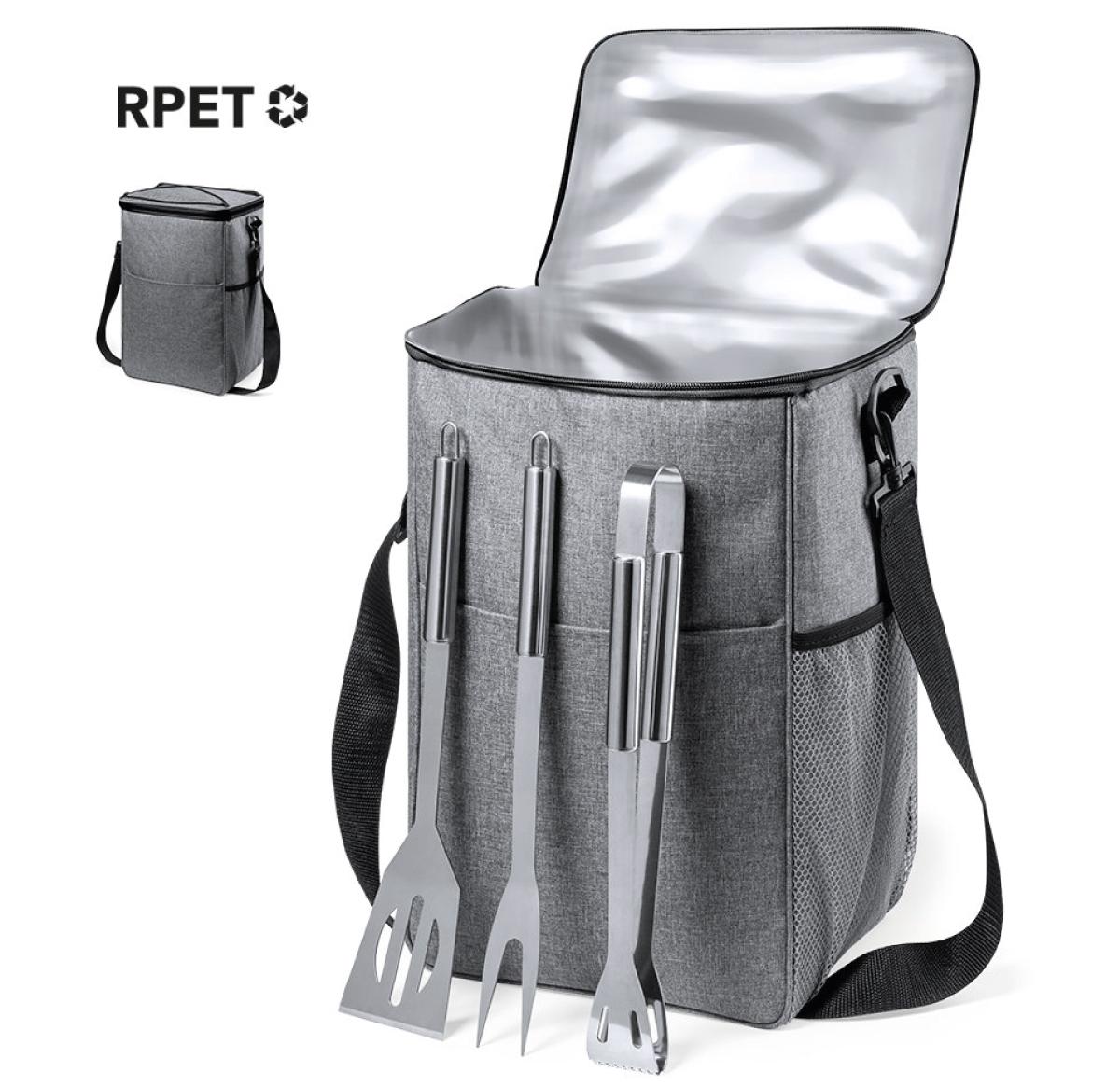Barbecue set with 3 accessories. Including: Carrying bag/cooler made in resistant RPET 300D polyester, made from recycled plastic, encouraging the reuse of plastic waste and helping the sustainability of the planet. With adjustable shoulder strap and carabiner, including PEVA isothermal interior to keep food at the proper temperature. RPET logo on outside label. Spatula, tongs and fork in metal, with black colour handles.