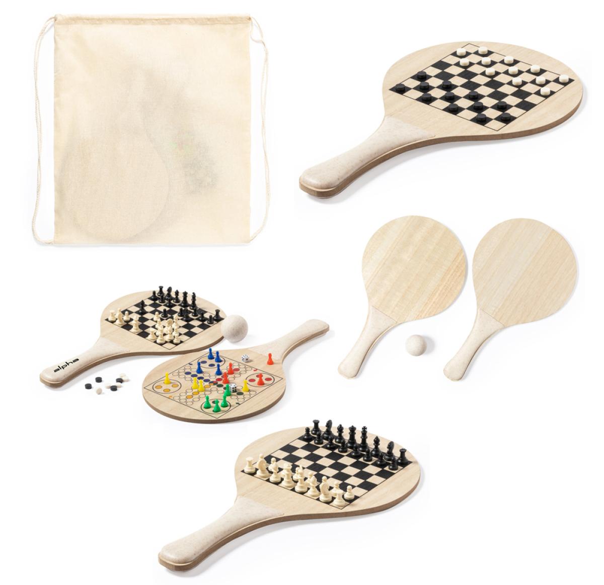 Pair of beach rackets with integrated chess, checkers and parcheesi boards. Made of wood, with handle coated in wheat straw and ball also in wheat straw. Including chess pieces, checkers, parcheesi pieces and dice. Set presented in an individual 100% cotton backpack with matching closing strings.