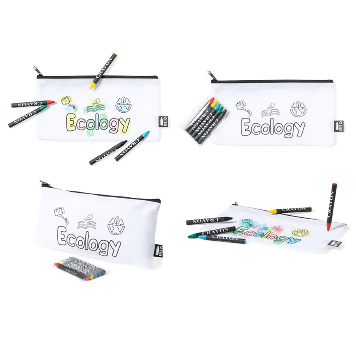 Case made of non-woven RPET in white, with zip closure and metal puller. Specially designed for coloring with crayons. Including 5 crayons in different colors. Outside label with the RPET distinctive.