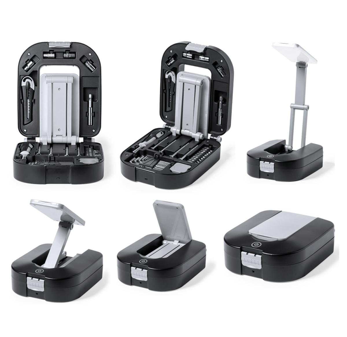 Genuine tool set with light and 30 accessories. Presented in a durable black ABS box with closure. Foldable lamp integrated in the box, with 24 LEDs and ON/OFF button. Includes screwdriver with many flat, philips, torx tips; precision screwdriver kit; tube spanners; allen spanners in different sizes; cutter and 1m flexometer. Battery-powered lamp (3xAA not included). Presented in an individual box with kraft design.