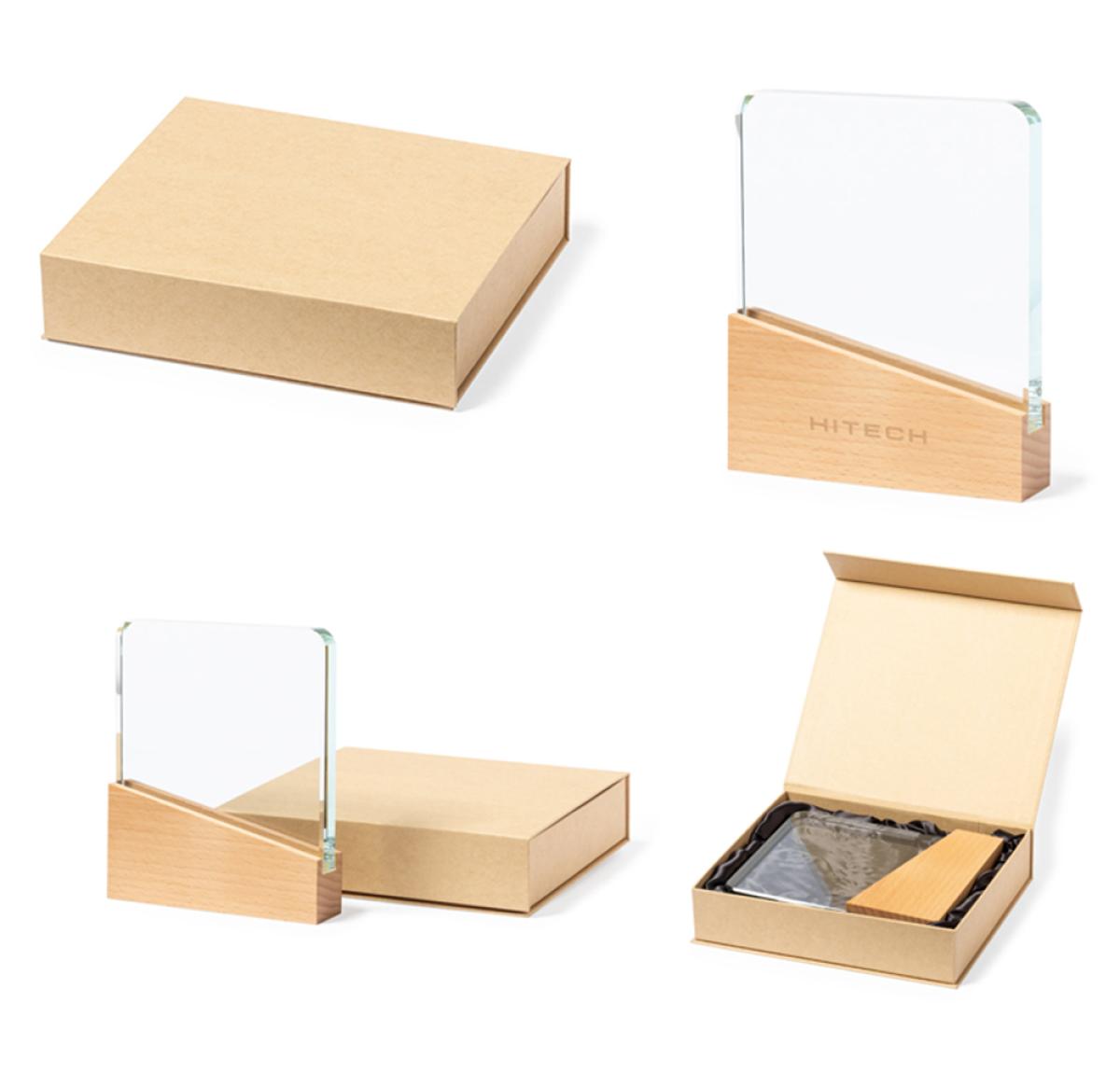 Commemorative plaque made of thick and resistant glass, with a natural wood base. Presented in a kraft protective case, with magnetic closure and foam inside.