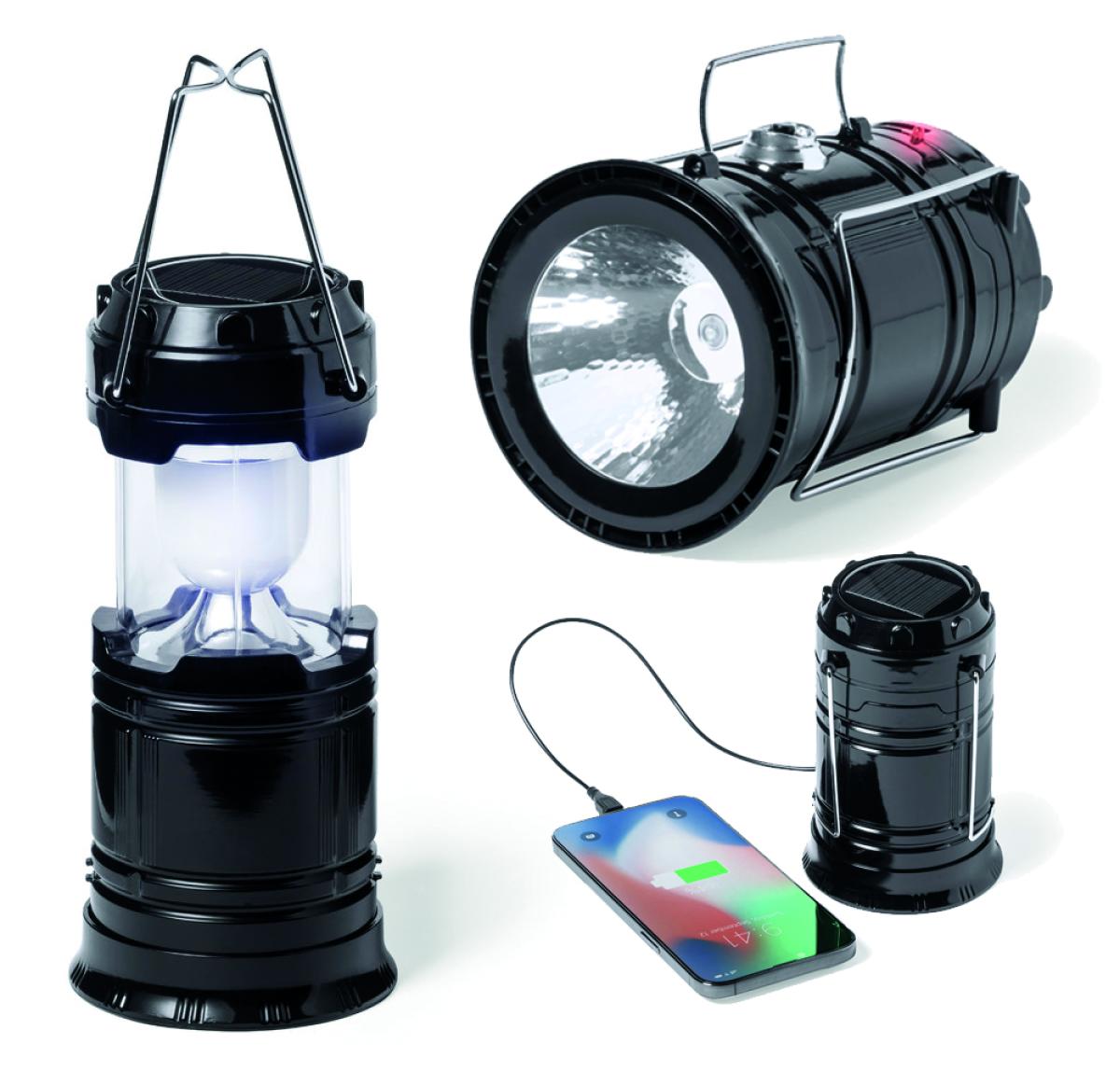 Solar-powered multi-functional lamp with integrated 1,200 mAh auxiliary battery and flashlight. Made in durable ABS material, with metal folding handles. Functions: Lamp with 6 white light LEDs and 60 lumens. Torch with 1 white light LED and 20 lumens 1,200 mAh lithium auxiliary battery with USB output and Micro USB input, Micro USB charging cable included (5V DC 1A). Presented in an individual kraft design box, with instruction manual in English and Spanish.