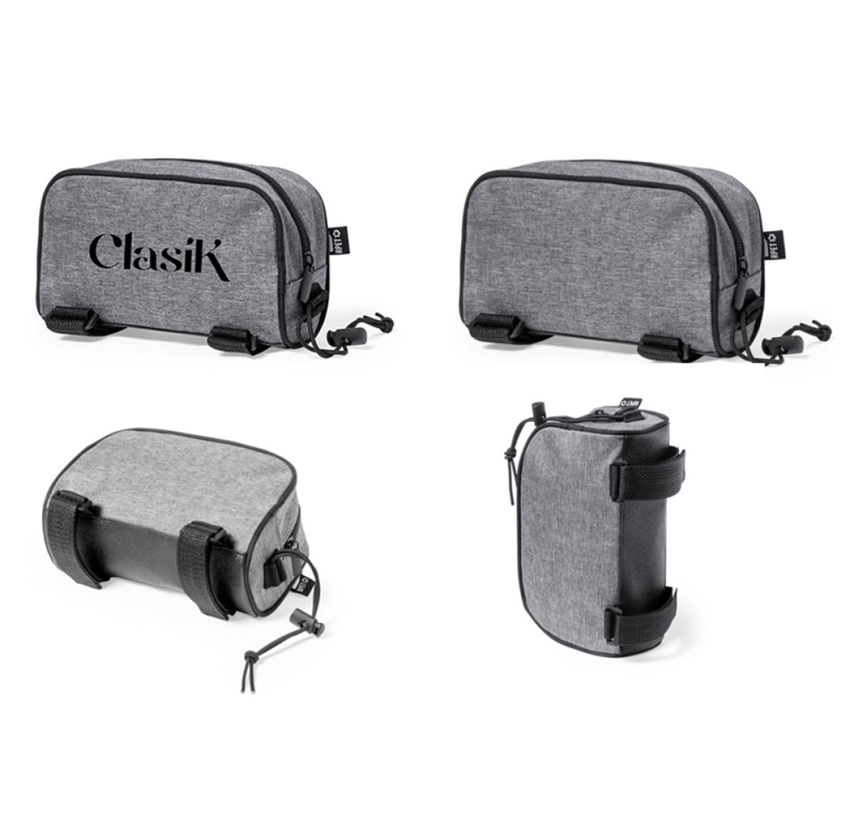 Scooter bar bag made of durable 600D RPET. Marbled grey finish with reinforced piping and main compartment with zip closure. Including double adjustable strap on bar with velcro fastening and elastic drawstring with adjuster. Outside label with the RPET distinctive.