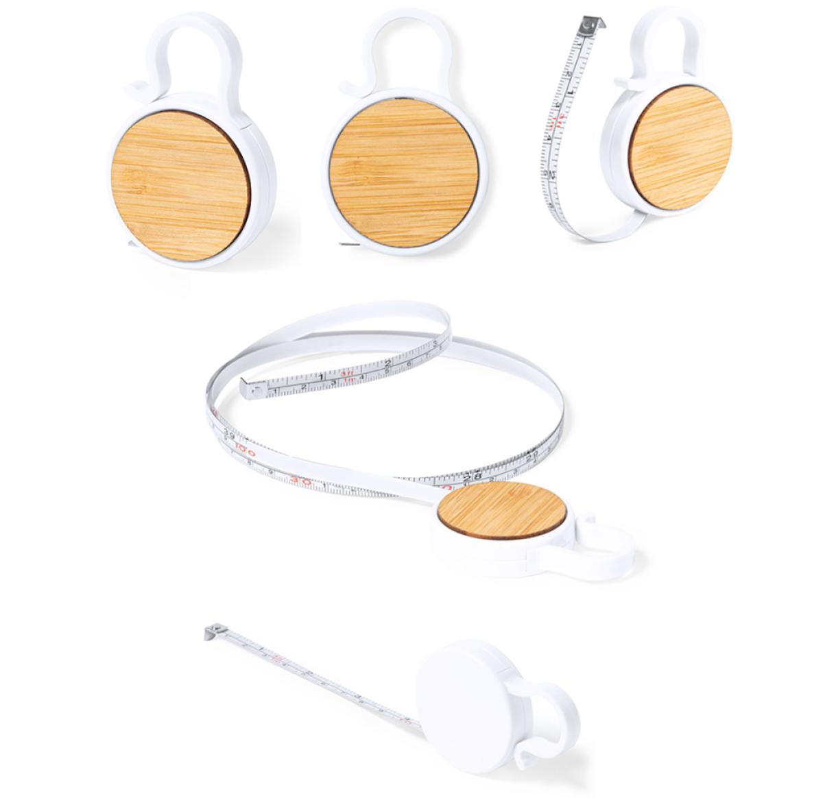 1 m flexometer in resistant white ABS, with bamboo insert on the body and transport ring. With wide branding surface and blade with measurements in centimetres and inches.