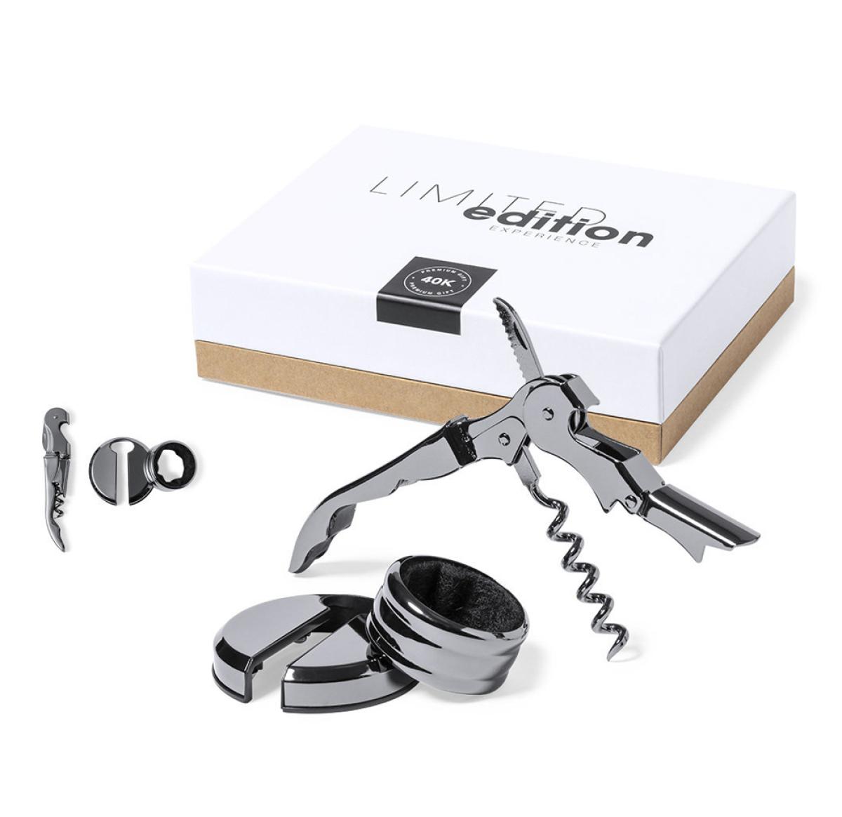 Wine set with exclusive design Limited Edition, manufactured in stainless steel, with an elegant black gloss finish. Including: 2-stage corkscrew/opener. Design drip stop. Capsule cutter with push mechanism. Presented in a Limited Edition Experience case, with unique design and protected by industrial property rights. Recycled cardboard card with Limited Edition description included.