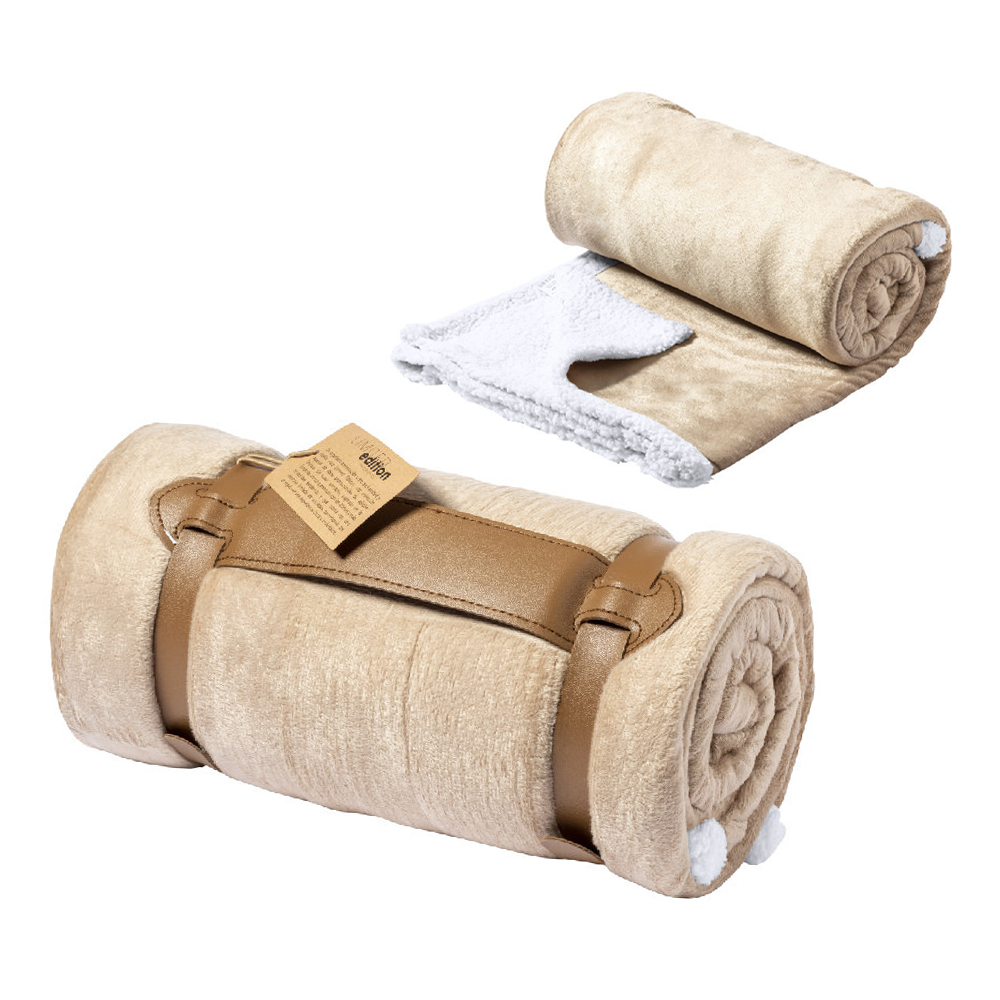 Blanket with exclusive design Limited Edition. In an elegant two-tone design, with a coral fleece exterior in camel and soft white lambskin inside. Manufactured in premium materials (Coral Fleece and Sherpa 380g/m2), with brown PU leather carrying strap. Presented in a Limited Edition Experience case, with unique design and protected by industrial property rights. Recycled cardboard card with Limited Edition description included.