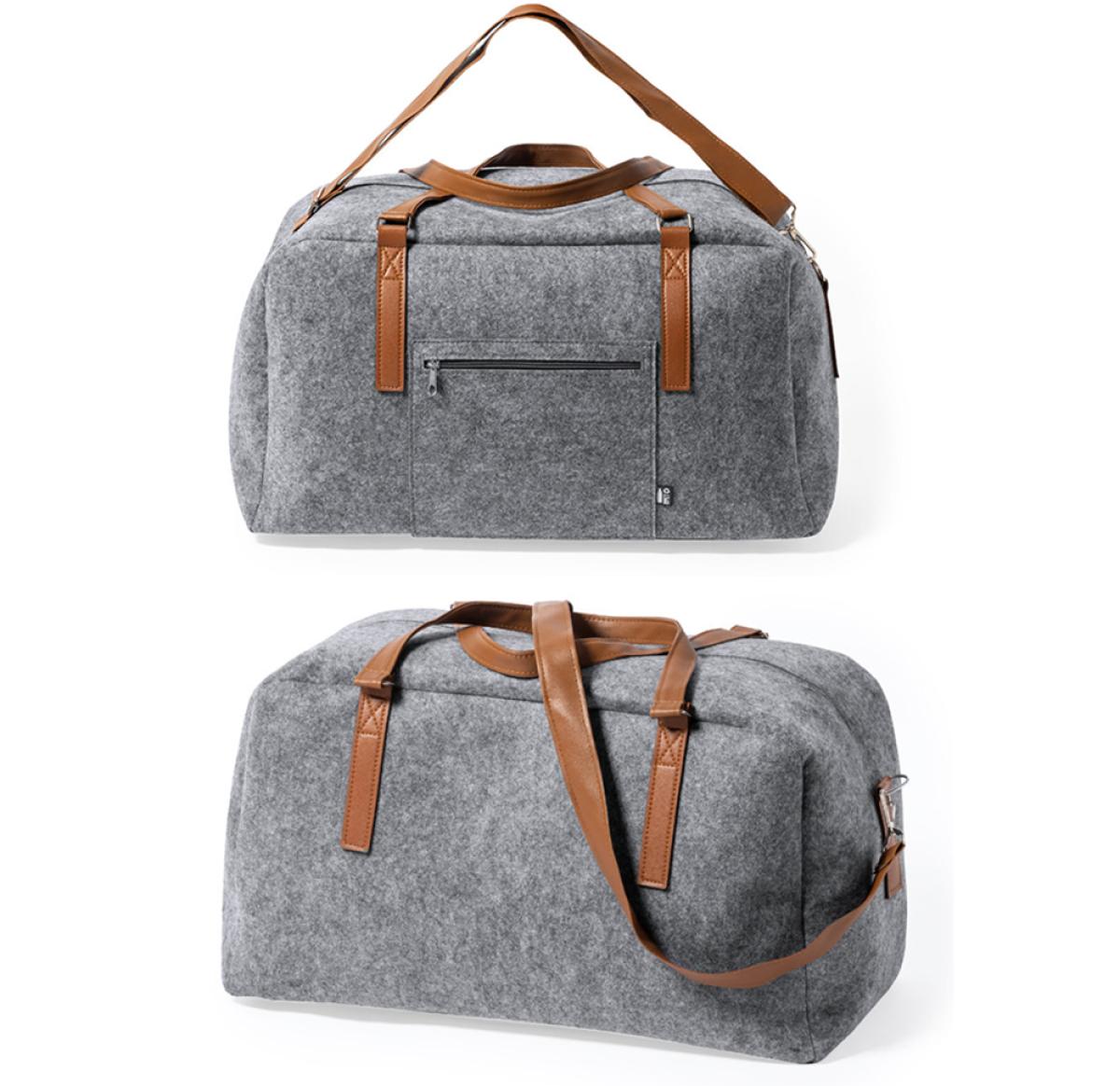 Stylish nature line bag made of durable Felt RPET. Main compartment with matching zip closure and double puller. Elegant brown PU leather handles with matching, adjustable shoulder strap. Outside zip pocket with RPET label.