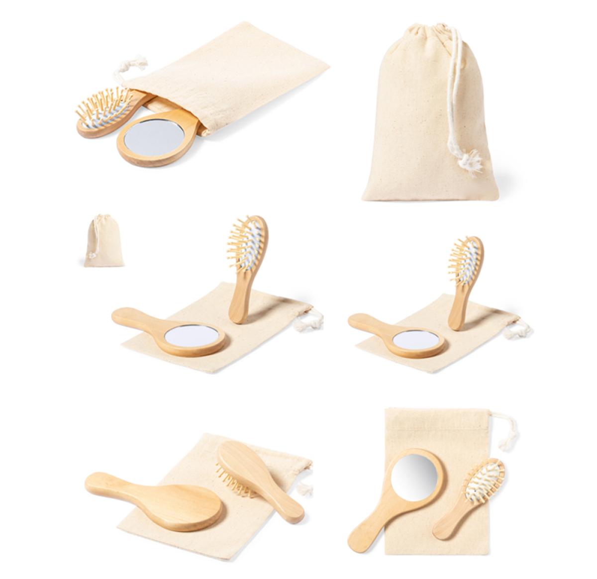 Set of mirror and brush, made in natural wood. Presented in a 100% cotton pouch with drawstring closure.