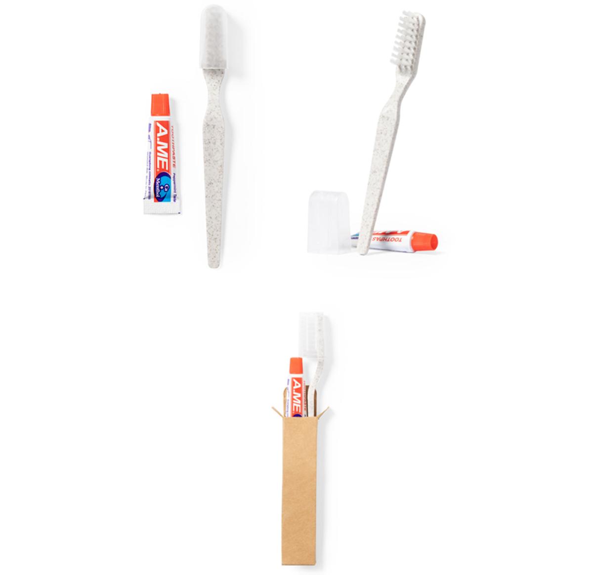 Dental set with toothbrush and toothpaste. Contents: Toothbrush made of wheat straw, promoting the use of natural raw materials and reducing pollutant emissions. Toothpaste in 6 g tube with screw cap.