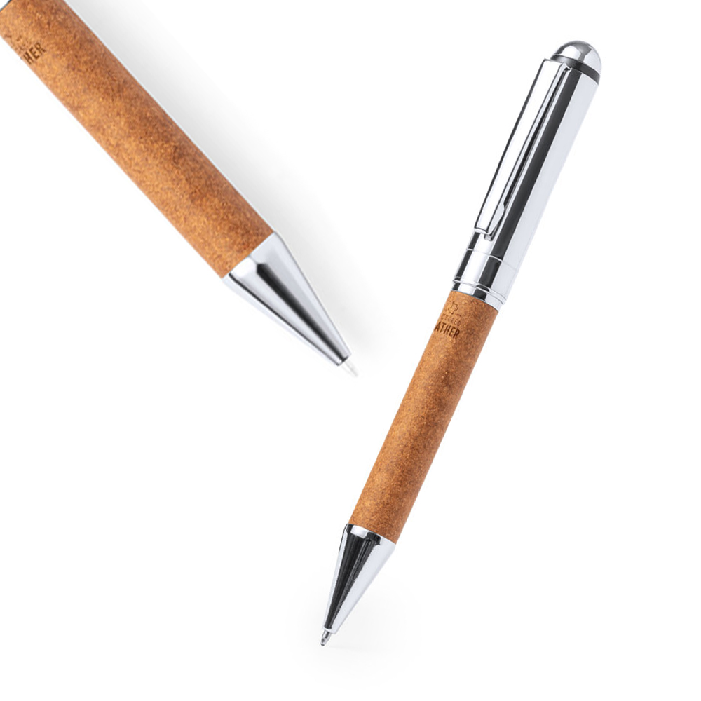 Ball pen made in chrome plated metal with recycled leather barrel. Stylish metal clip and matching accessories, twist mechanism and blue ink. With the distinctive of recycled leather on the barrel and presented in an individual kraft design case with matching sleeve.