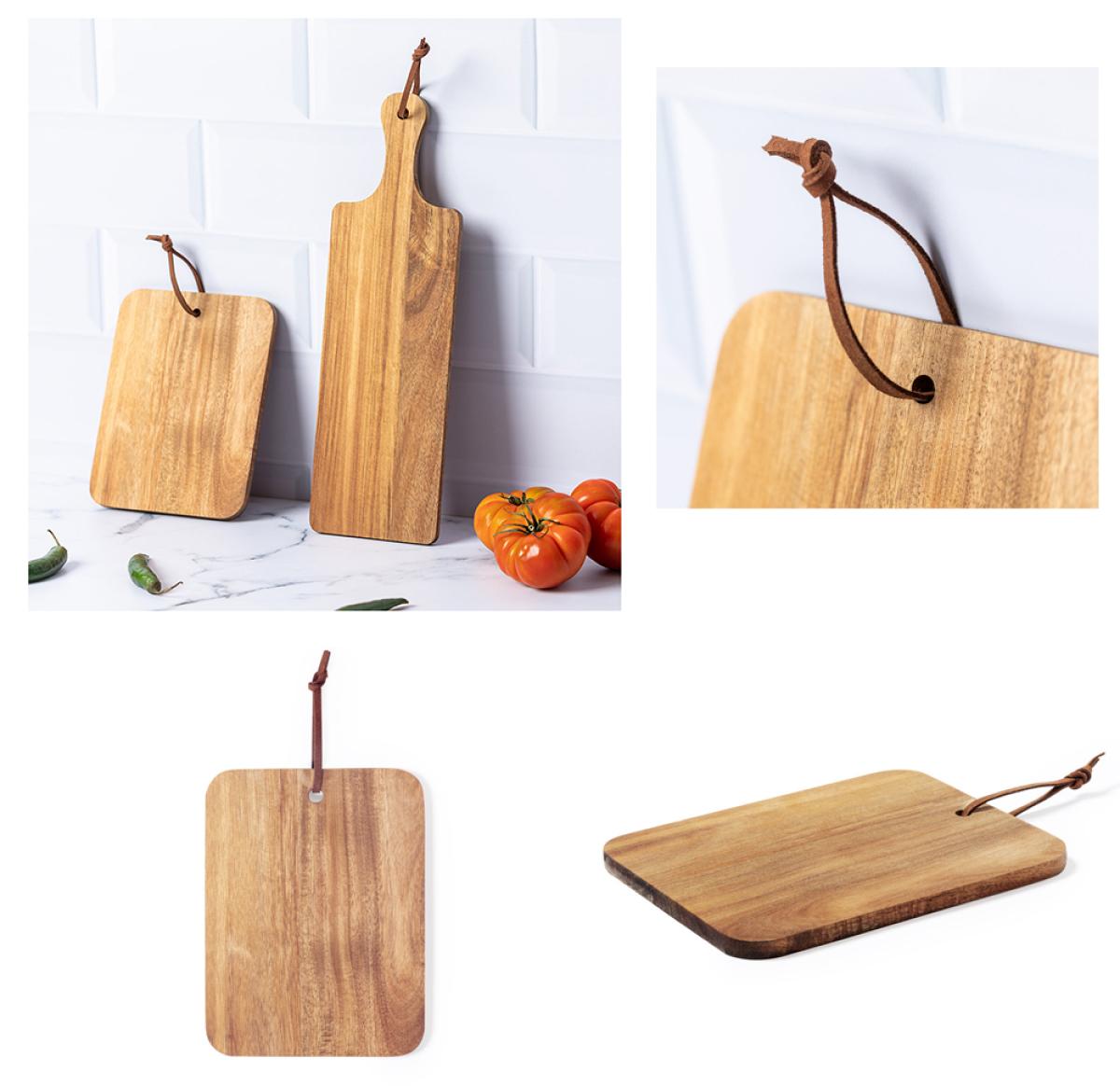 Cutting and presentation board made of natural wood. In rectangular format, with matching cord in durable PU leather.