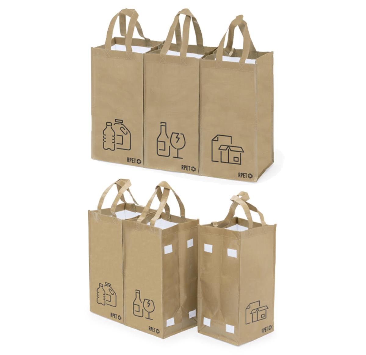 Set of 3 recycling bags. Manufactured in strong RPET laminated polyester, made from recycled plastic, to encourage the reuse of plastic waste and help the sustainability of the planet. Including 3 bags of 23x45x23 cm each, attached to each other with velcro fasteners on the sides. With reinforced handles and marked with waste types: plastics and packaging; glass; and paper. Label with RPET logo at the base of each bag.