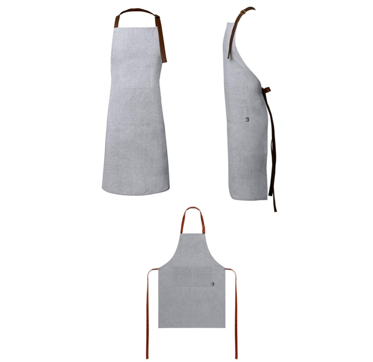 Nature line apron in RPET material, made from recycled plastic, to promote the reuse of plastic waste and help the sustainability of the planet. Fitted under the knee, with adjustable straps in resistant PU leather and a large front pocket. Label on pocket with RPET logo.