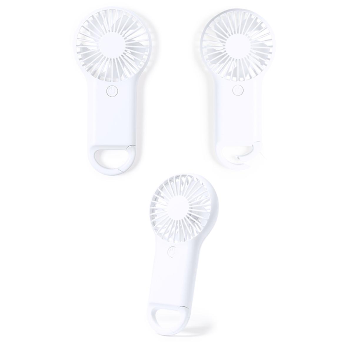 Fan made of resistant ABS in white colour, with integrated carabiner. With 2 operating speeds and presented in an individual box with kraft design. Battery powered (3xAAA not included).