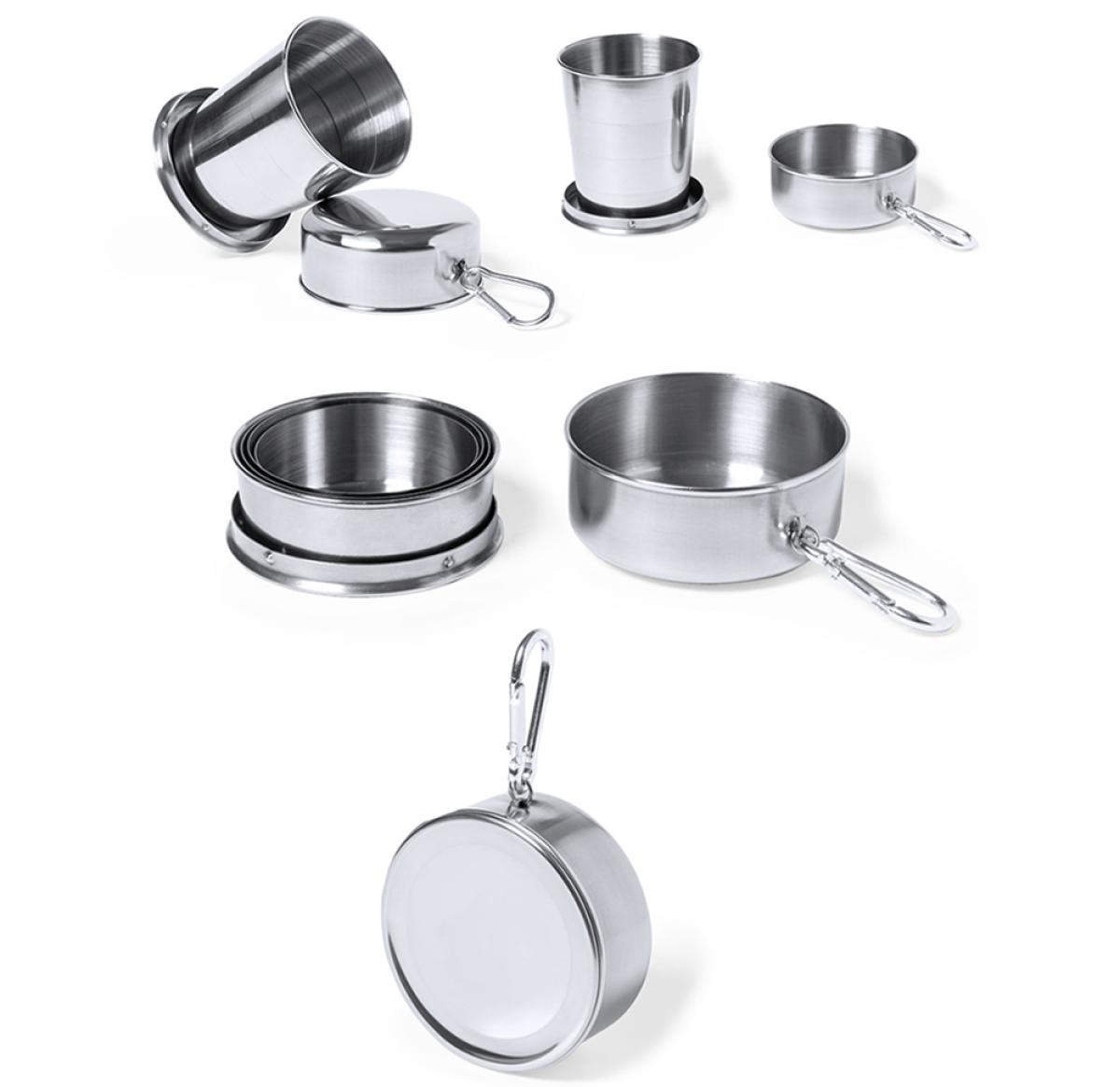 Original folding cup for emergencies made of stainless steel. With a capacity of 220ml and carrying metal carabiner.