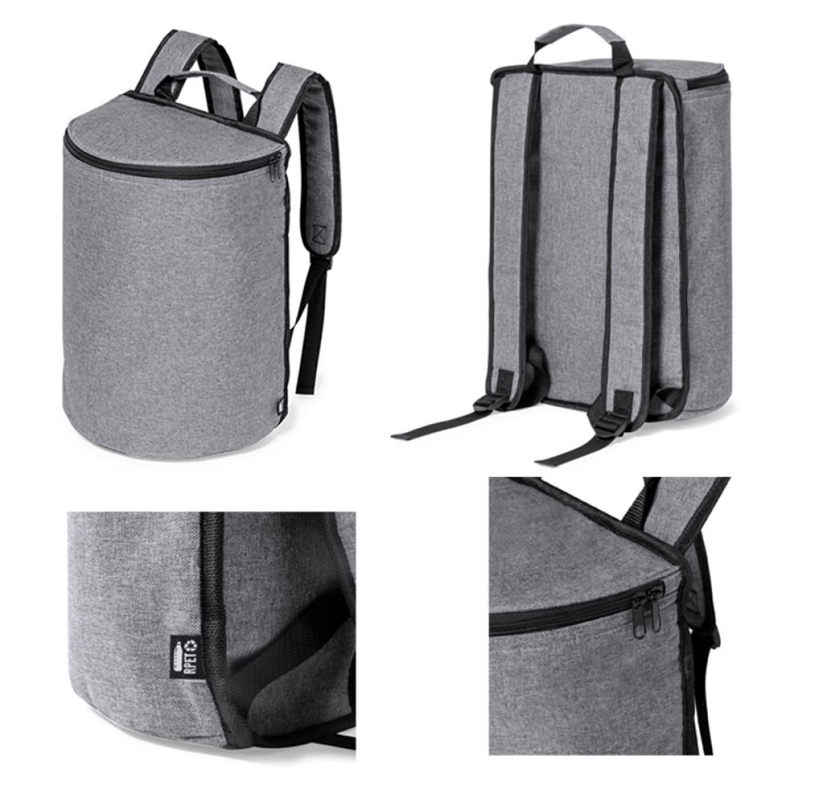 Cooler backpack made of resistant 600D RPET. Grey finish, with carry handle. Padded and adjustable shoulder straps. Main compartment with zip closure and metal pullers. Aluminium isothermal inside and outside label with the RPET distinctive.