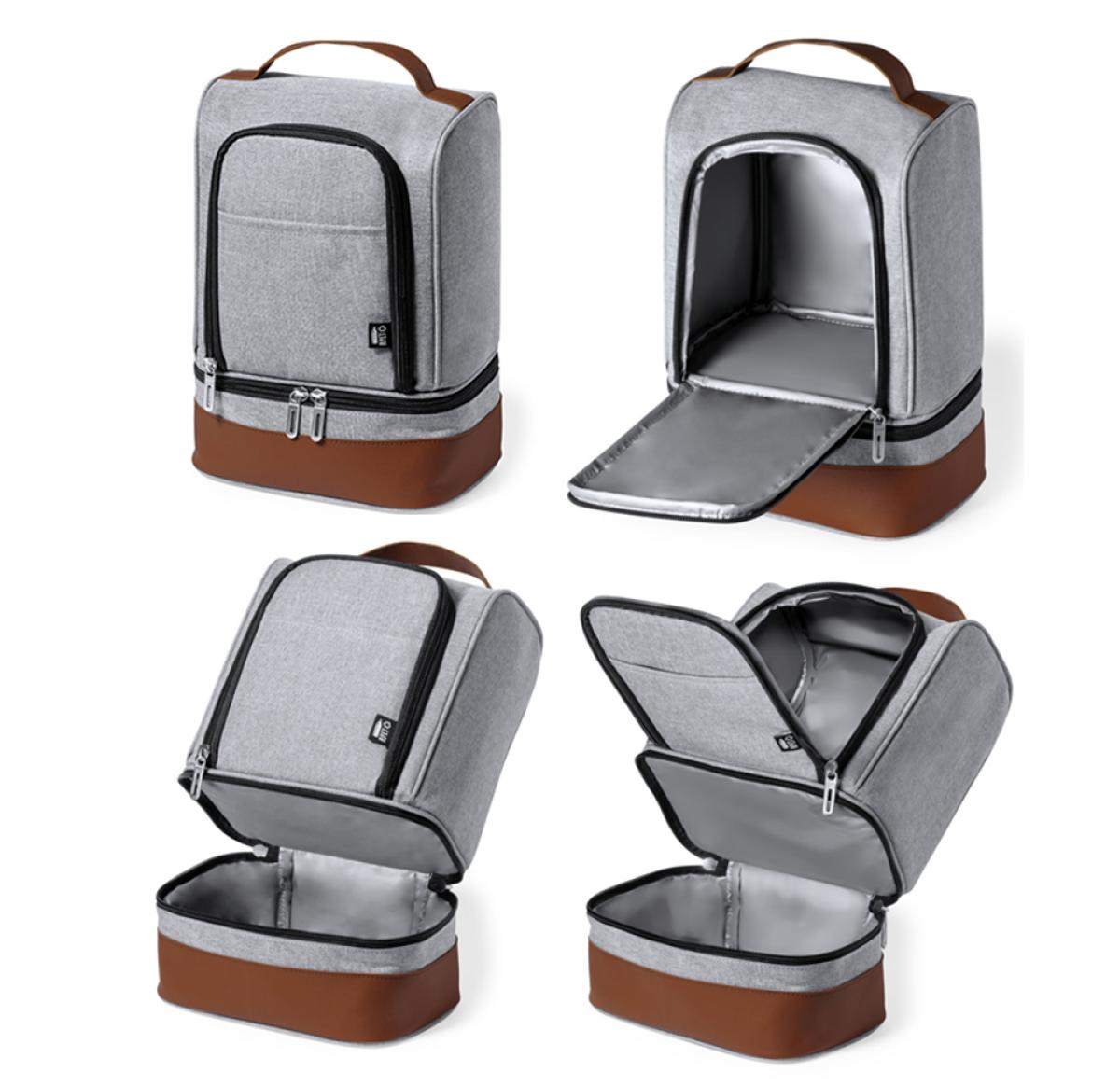 Cooler bag made of resistant 600D RPET. Grey finish, with base and carrying handle in brown PU leather. 2 independent compartments, with zip closure and metal handles. PEVA isothermal inside and outside label with the RPET distinctive.