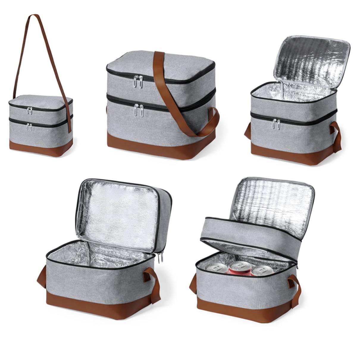 Cooler bag made of resistant 600D RPET. Grey finish, with brown PU leather base and shoulder strap. Including 2 independent compartments, with zip closure and metal pullers. PEVA isothermal inside and outside label with the RPET distinctive.