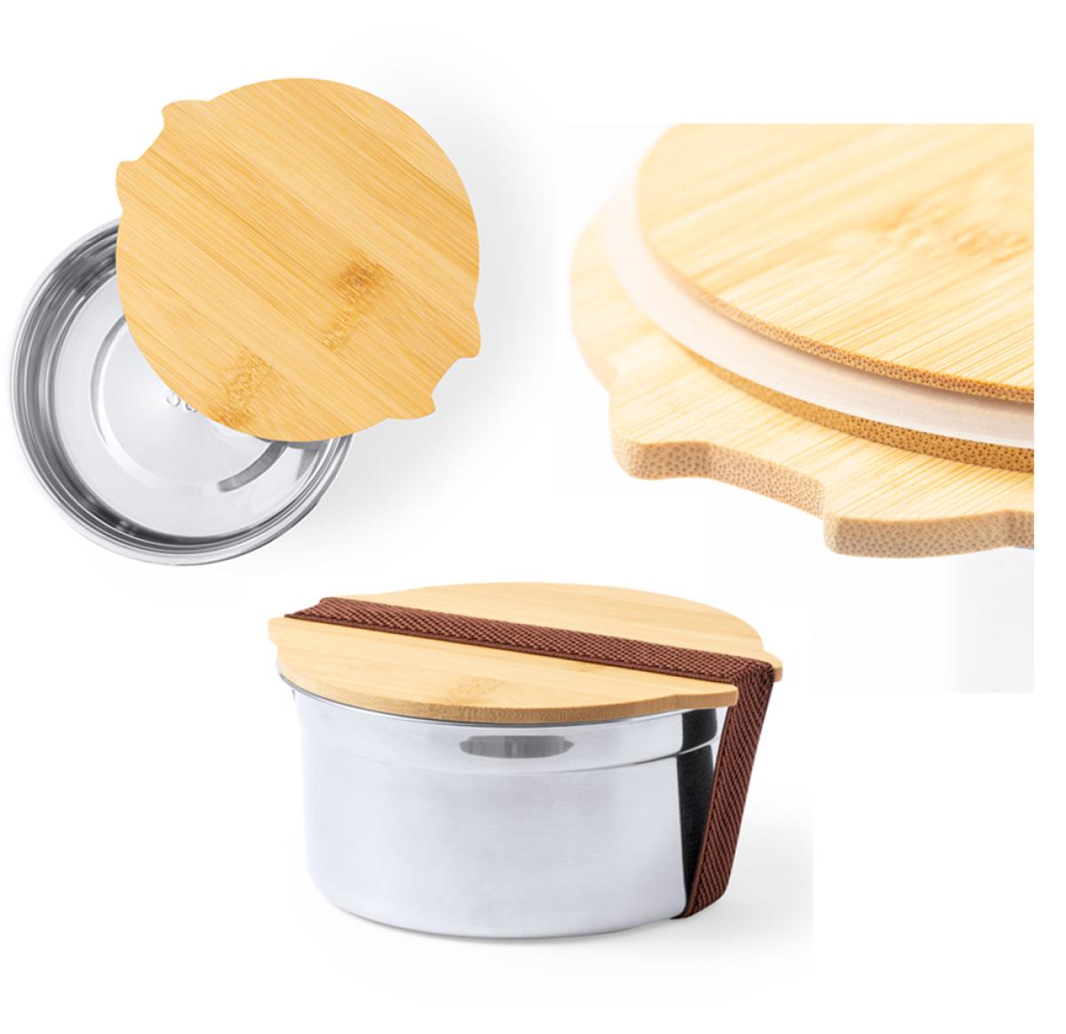 800 ml capacity lunch box, made in stainless steel. With hermetic lid in bamboo and elastic closure band. Presented in an individual box with kraft design.