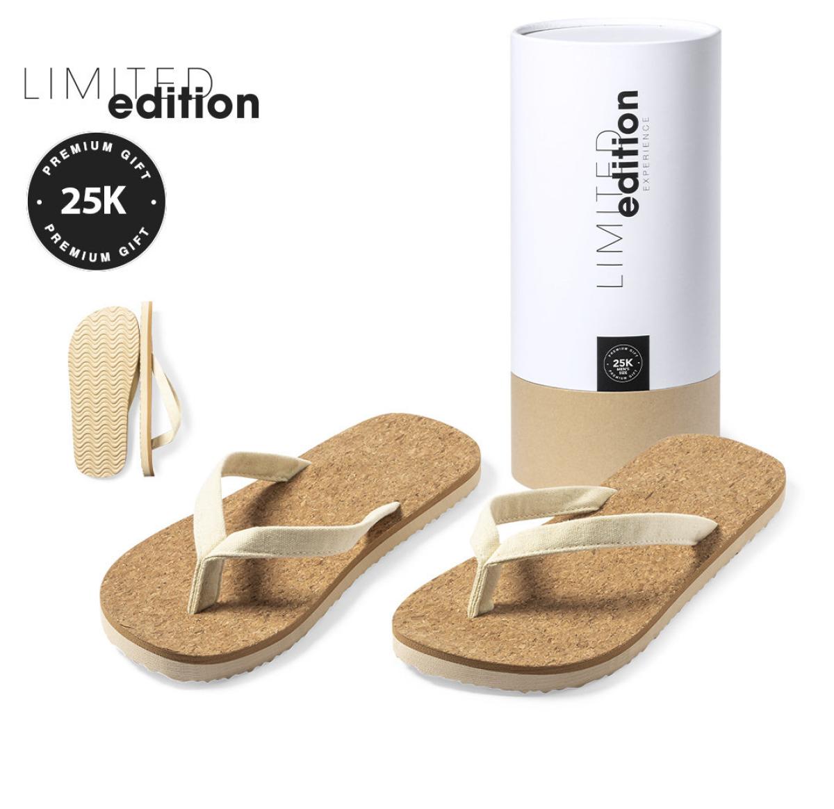 Pair of flip flops with exclusive design Limited Edition. Upper sole made in natural cork, with straps in natural colour matching the sole. Available in sizes 36-38 and 42-44. Presented in a Limited Edition Experience case, with unique design and protected by industrial property rights. Recycled cardboard card with Limited Edition description included.