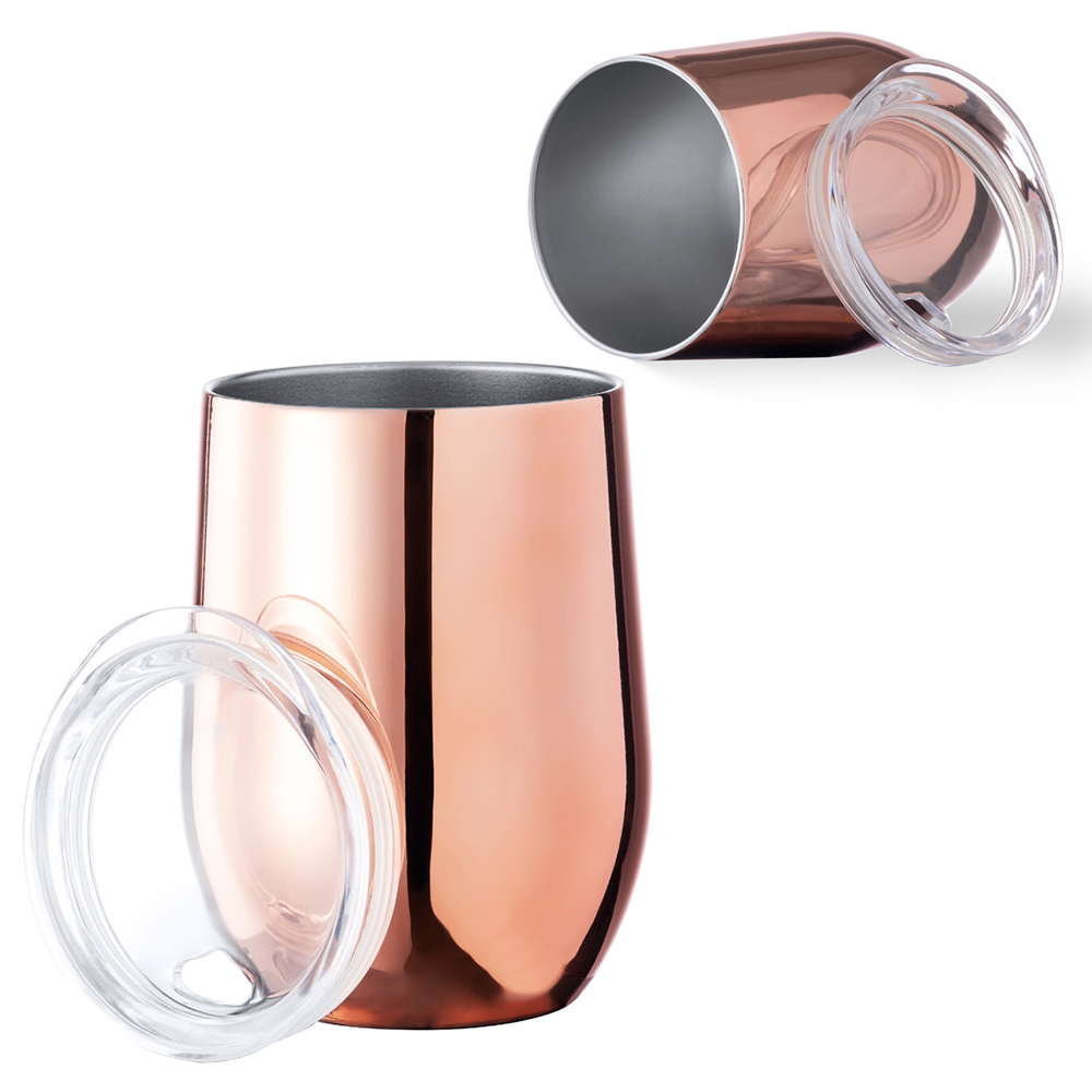 Double wall, stainless steel thermal cup with 350ml capacity and galvanized copper coating outside. BPA free lid dispenser. Presented in an individual black design box.